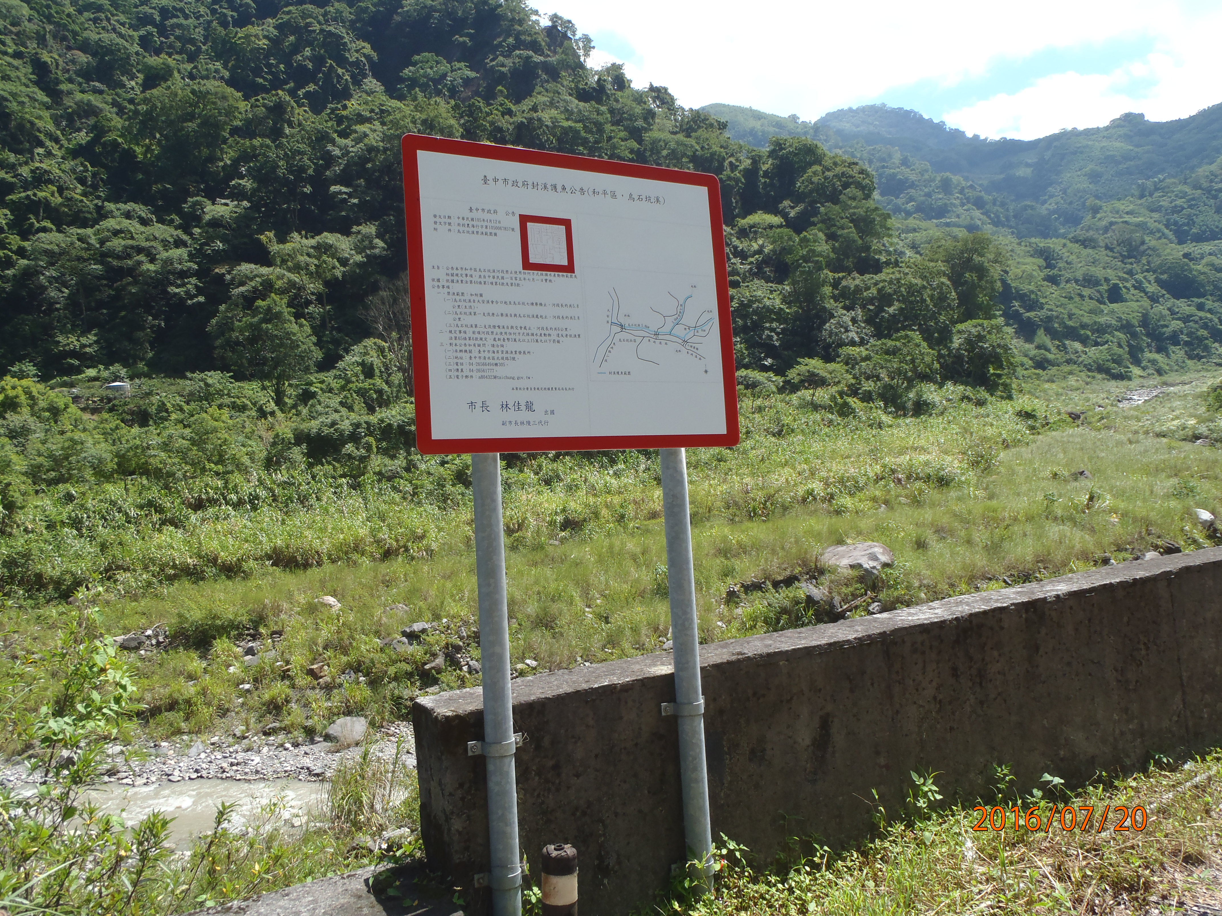 農業局表示,為保護河川生態永續發展,市府自105年7月1日起,公告烏石坑溪為封溪護魚河段,嚴禁任何方式採捕水產動物,現由當地居民組成巡守隊進行生態保育。