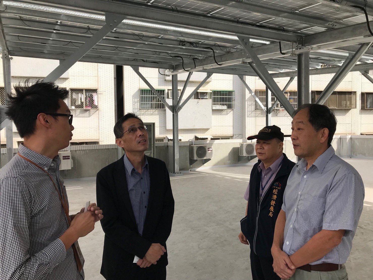 經發局長張峯源說明,市府推動太陽光電,由機關帶頭做起,目前將閒置公有房舍屋頂設置太陽光電,如捷運公司將在軌道維修廠屋頂設置太陽光電系統、教育局也在風雨操場搭設太陽光電板;此外,民眾也可加入中央「綠能屋頂全民參與推動計畫」,由市府遴選營運商,民眾可出租屋頂,供營運商設置太陽光電,並收取一定比例回饋金。