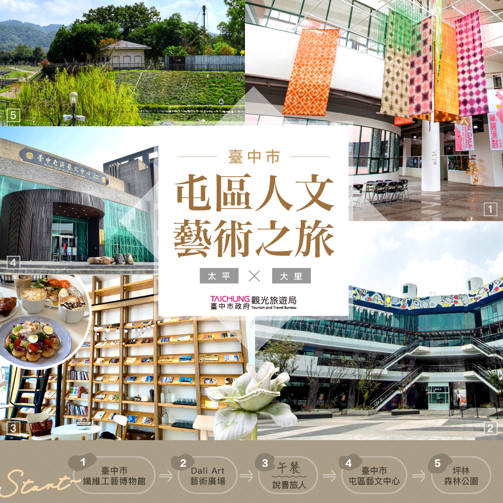 國內旅遊選擇多元,市府觀旅局規劃「屯區人文藝術風情一日遊」行程,一日遊路線從大里區開始,先到台灣首座以「纖維.時尚.綠工藝」為主題的纖維工藝博物館,接著到Dali Art藝術廣場逛逛,中午可以享受戶外野餐,下午再到太平區屯區藝文中心回味童年樂趣,最後前往鄰近的坪林森林公園散步,享受傍晚時分寧靜的氛圍,結束一天的旅程。