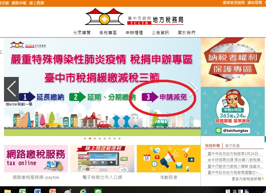 地稅局表示,台中市在3月初率全國之先推出紓困九箭後,各機關持續滾動式檢討各項紓困措施,其中第八箭稅捐減免和緩繳措施,主動幫民眾減地價稅、房屋稅、使用牌照稅、娛樂稅,協助分期及延期繳納,日前更加碼推出稅捐緩繳2.0版,放寬申請延期或分期繳納稅捐的適用對象和條件。
