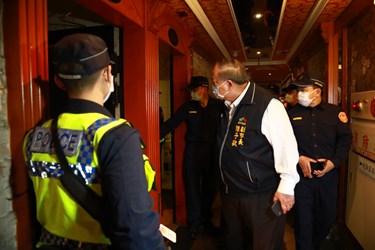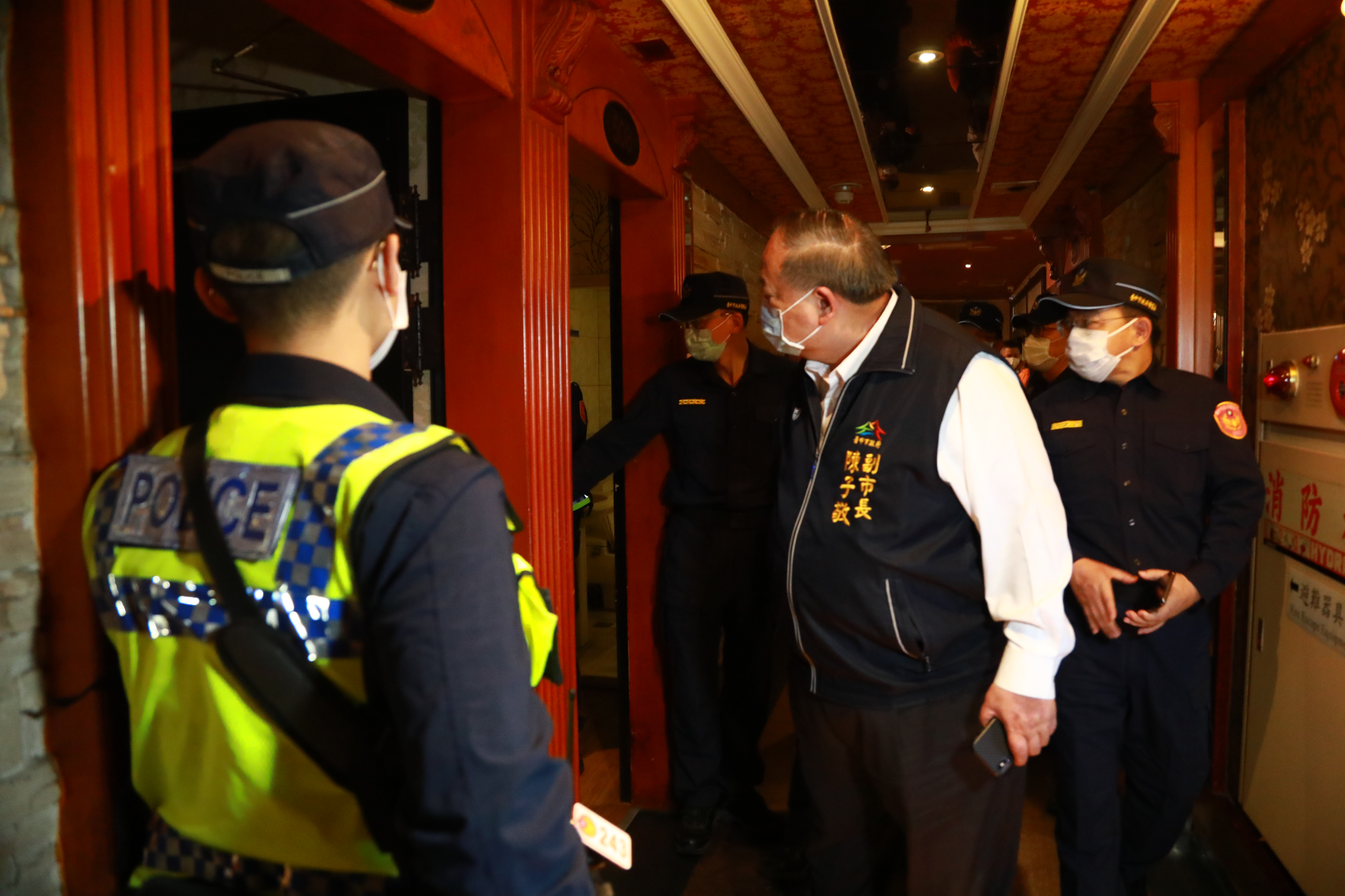 台中市長盧秀燕指示市府跨局處成立聯合稽查小組,9日起一連四天強力稽查,今晚由陳副市長率經濟發展局長張峯源、警察局長楊源明聯合稽查5家視聽歌唱業及1家按摩業。張局長表示,該場所登記經營按摩業,雖非屬特種行業,卻有女陪侍事實,將依法裁罰、要求停業;而其餘視聽歌唱業者,4間配合停業、1間配合實名登記,無違法情事。