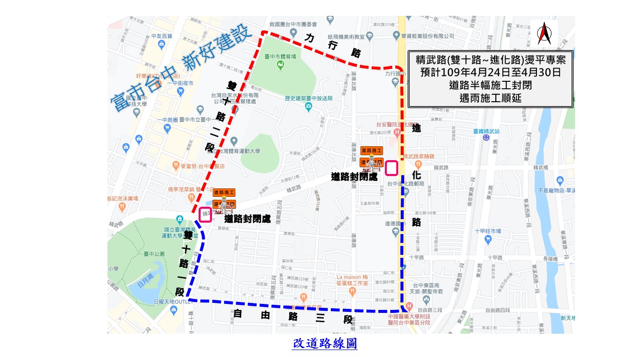 對此,市府特別動用第二預備金1,326萬元施工,路面刨鋪面積約2萬1,500平方公尺,預計施作範圍從雙十路至進化路口,同時調整路面孔蓋下地139處,並預先改善受損路基3處,未來燙平完工後,將可大幅提升行車安全舒適度。(4/22*7)*建設局
