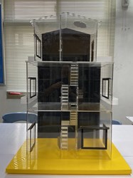 消防局第五大隊外埔分隊為讓防火宣導更有效果,特別以透明壓力克製作濃煙模型屋,室內格局與一般的透天厝一樣,利用燃燒煙餅快速製造類似濃煙流竄,模擬一樓起火時,樓梯、頂樓及房間的濃煙情形,讓民眾瞭解常聽到的煙囪效應、關門避難等專業知識,透過實驗加深民眾印象。