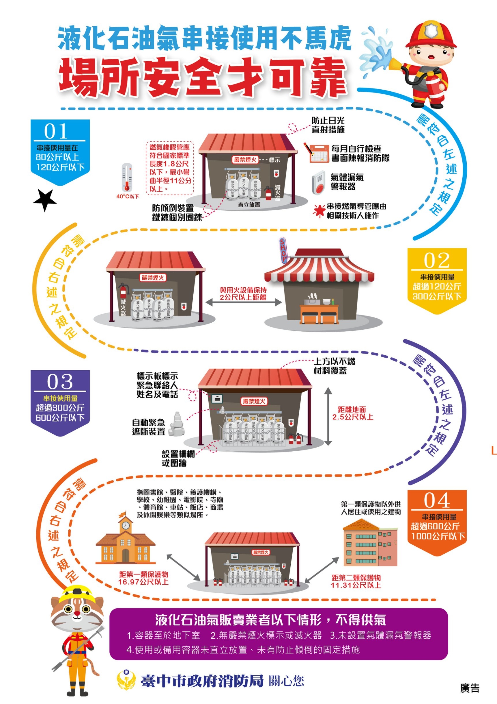 消防局表示,液化石油氣容器串接80公斤以上營業場所,應符合「公共危險物品及可燃性高壓氣體製造儲存處理場所設置標準暨安全管理辦法」第73條之1規定;容器串接80公斤以下營業場所,則應依循內政部消防署訂定「使用液化石油氣容器營業場所安全管理行政指導綱領」設置管理,強化自主檢「液」能力,落實自主檢查及更換液化石油氣容器作業安全。