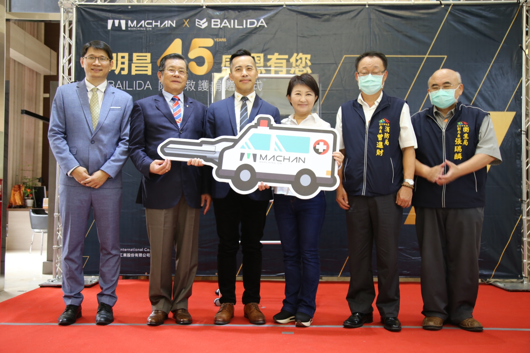 今日捐贈儀式於明昌總部大樓舉行,由市長盧秀燕率領秘書長黃崇典、市政顧問林雲珍、消防局長曾進財、農業局長蔡精強、經發局長張峯源、交通局長葉昭甫、民政局長吳世瑋、財政局長羅仙法、衛生局副局長張瑞麟、新聞局副局長陳佳君及勞動檢查處長邱怡川出席,接受明昌國際工業股份有限公司創辦人張秋龍捐贈的救護車模型與鑰匙及25組耳鼻喉診斷保護隔板,並回贈感謝匾額。立法委員楊瓊瓔、市議員李榮鴻、楊典忠、外埔區長葉聯慶、大安區長周琇茹與多位在地里長以及第五大隊救護大隊大隊長吳章銘及分隊長廖維封到場見證,台中市議會議長張清照也派代表出席。(5/27*6)*消防局