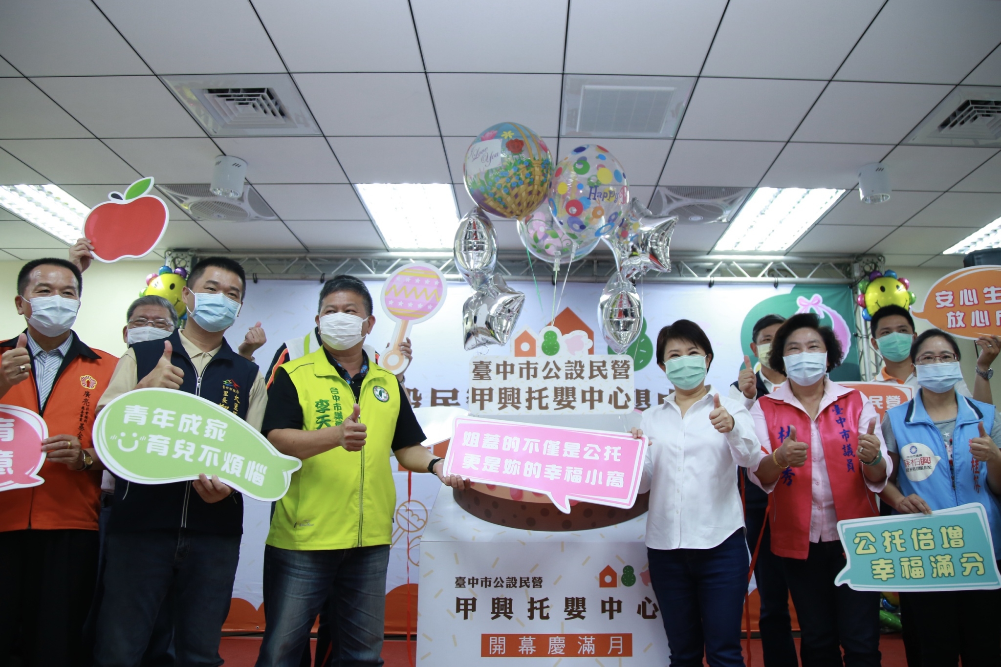 台中大里區人口數已躍升為台中第三大,年輕家庭數量持續增長,但長年沒有公托中心,市長盧秀燕上任一年多,立刻盤點增設大里、甲興兩處公托,今(28)日甲興托嬰中心舉行開幕慶滿月,盧市長親自到場發送滿月紅蛋,與家長、小孩一同慶祝,她說,未來會持續盤點適當地點,力拚公托倍增,提供家長托嬰最好的服務。