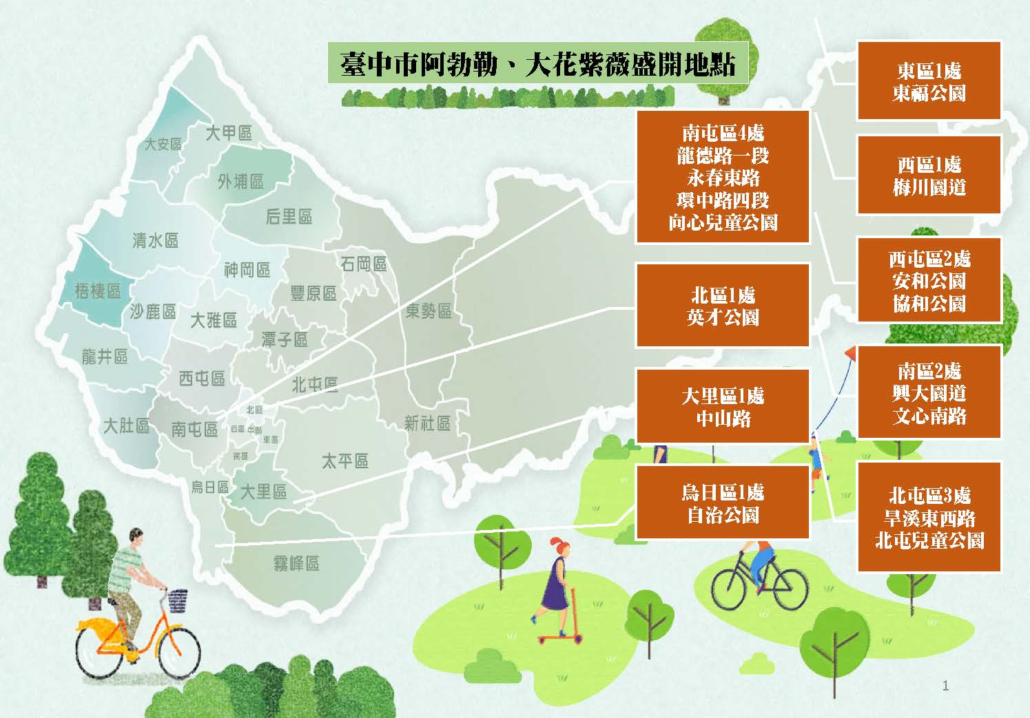 陳局長表示,阿勃勒與大花紫薇常作為台中市景觀樹木,主要位於旱溪東西路、龍德路一段、梅川園道、興大園道及環中路四段等道路,以及中區、東區、北區、西屯區、北屯區、南屯區等大小公園內;呼籲喜愛賞樹的民眾,把握賞花期限,趁著繁花盛開至賞花景點拍照、打卡,推廣台中樹木之美。(5/30*7)*建設局