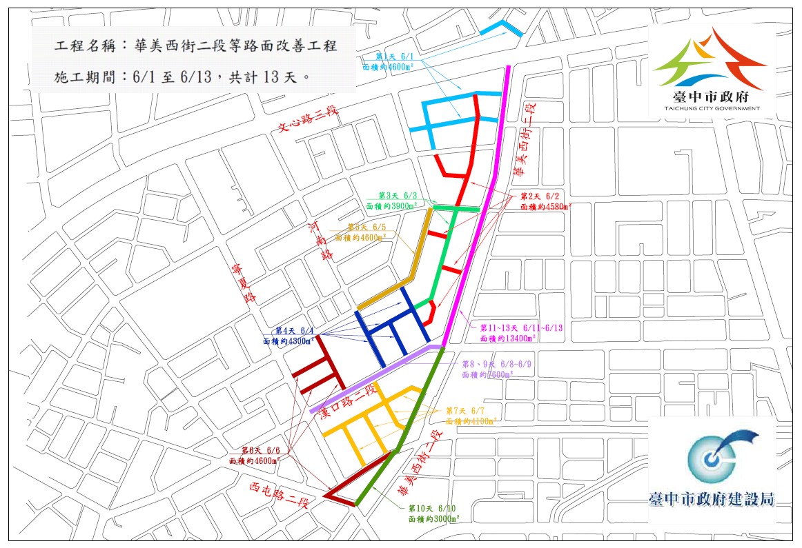 西屯區華美西街一帶是人口稠密的住宅區,在汙水下水道接管工程完成後,台中市政府建設局接續配合自來水公司,汰換自來水管線為堅固耐用的DIP(鑄鐵管)材質,解決當地自來水管爆管及漏水問題,並啟動道路燙平工程,預計6月13日完成路面刨除重舖,改善華美西街二段(文心路三段至西屯路二段)及周邊巷道,同時解決汙水、自來水及行車安全問題。