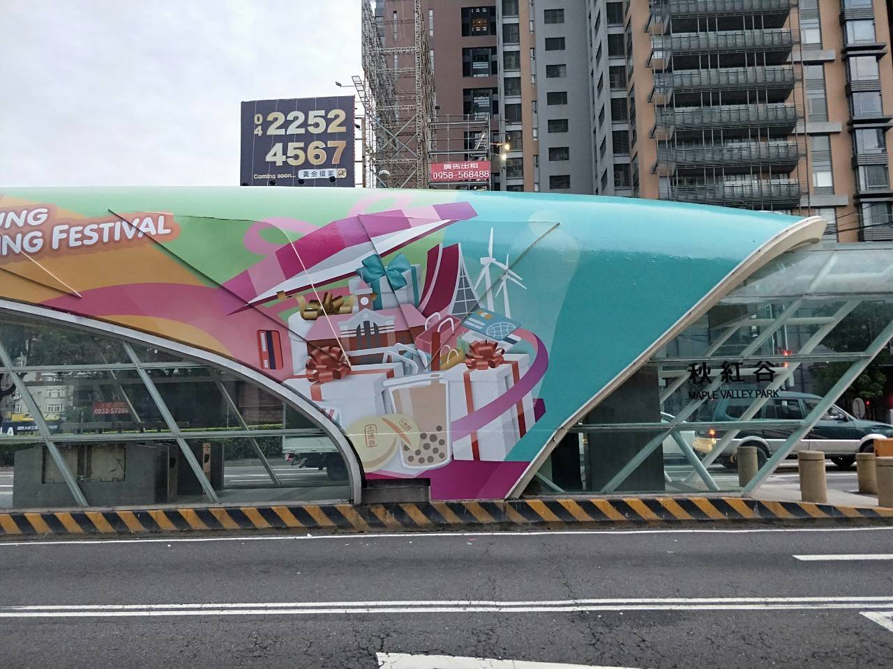 經發局表示,市府這次規劃一系列台中購物節意象裝置,歡迎市民朋友一同來發掘,率先露出的是秋紅谷公車專用道站體彩繪意象,主視覺以「打開禮物盒的驚喜」為設計,有象徵裝載台中名產的禮物盒,以及太陽餅、珍奶等台中名產,更有湖心亭、台中國家歌劇院、路思義教堂等知名地標,色彩繽紛吸睛。