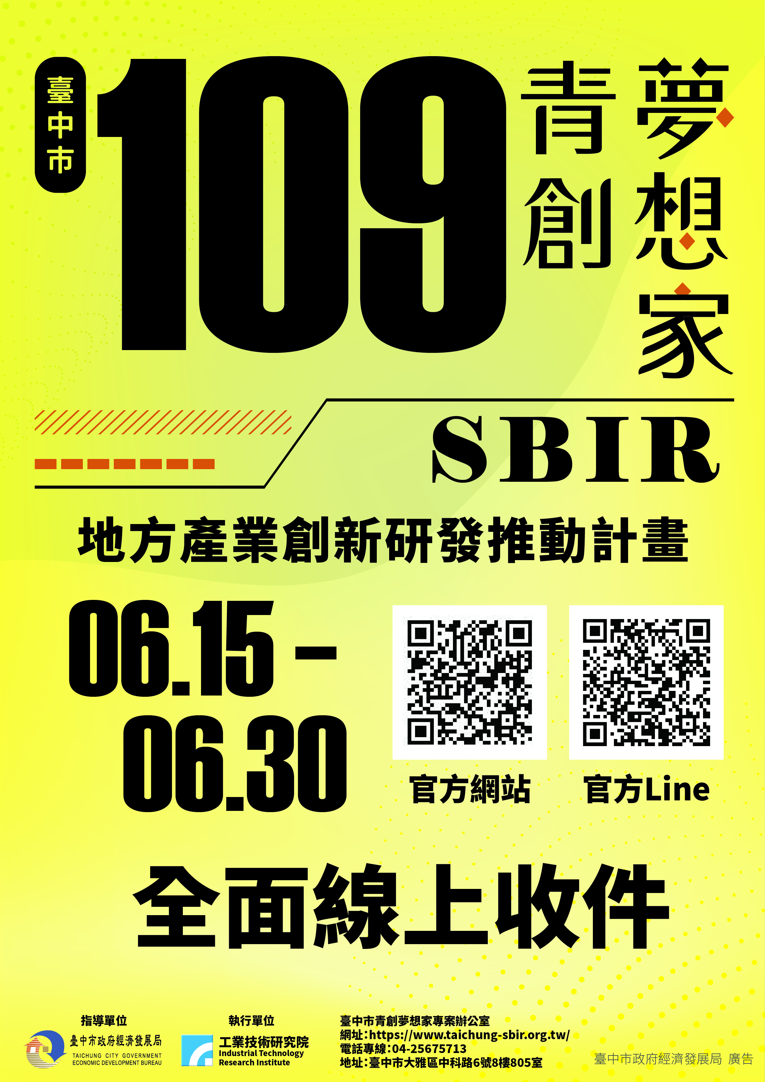 此外,為協助轄內企業快速瞭解計畫內容,經發局也建置「台中市青創夢想家網站專區」( https://www.taichung-sbir.org.tw/ ),整合申請資訊、表單及線上申請系統等資訊,如有任何諮詢需求,歡迎至計畫服務網頁或電洽台中市青創夢想家專案辦公室( 04-25675713 )洽詢。