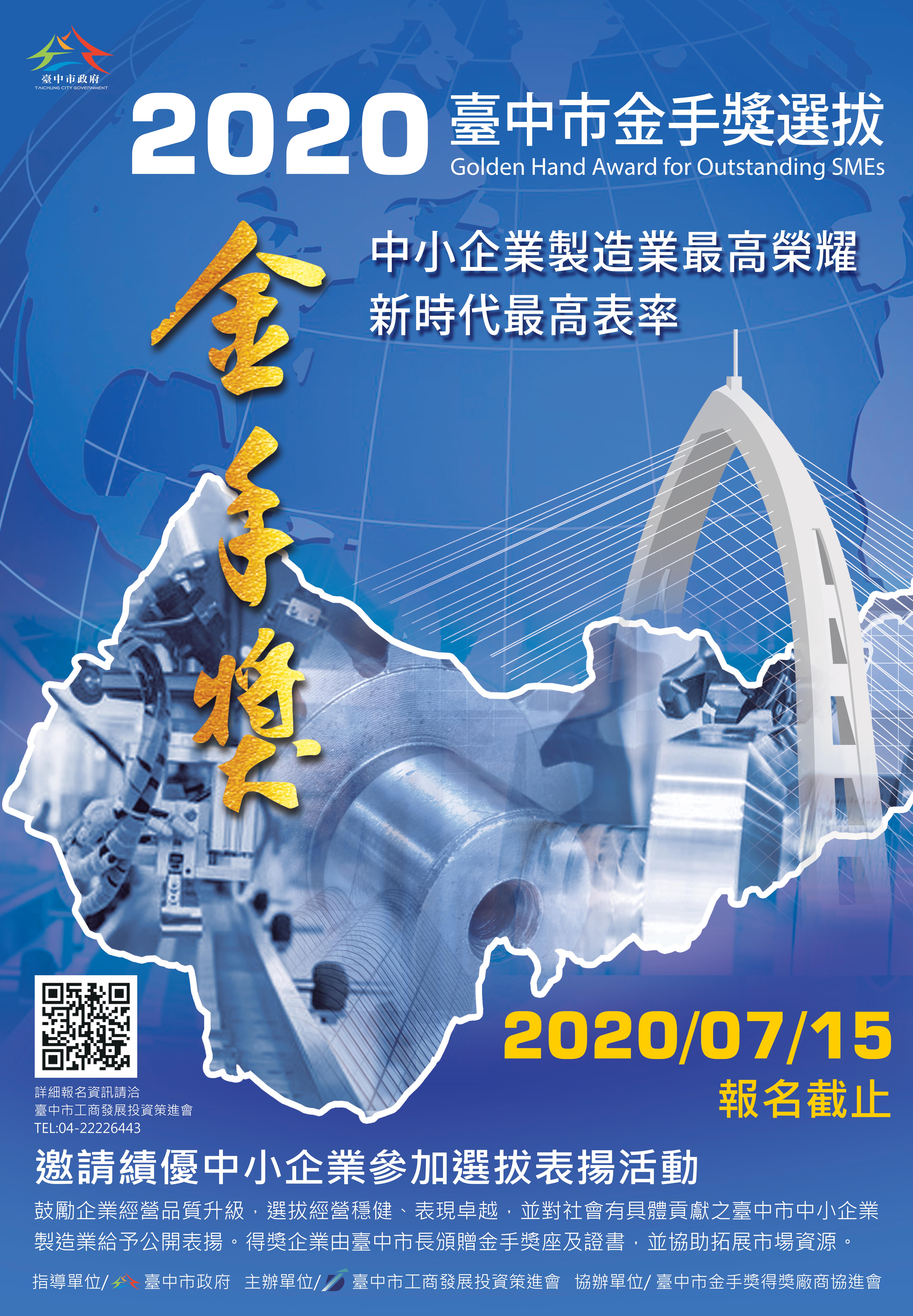 台中市工商發展投資策進會主辦第19屆台中市金手獎選拔活動,即日起至7月15日止受理報名,邀請台中市符合參選資格的中小企業製造業廠商踴躍報名參加。工策會將透過縝密評選,選拔出經營穩健、表現卓越,對社會有具體貢獻的中小企業並給予公開表揚,不僅傳承台中製造業的黑手精神,也有助提升整體產業競爭力。