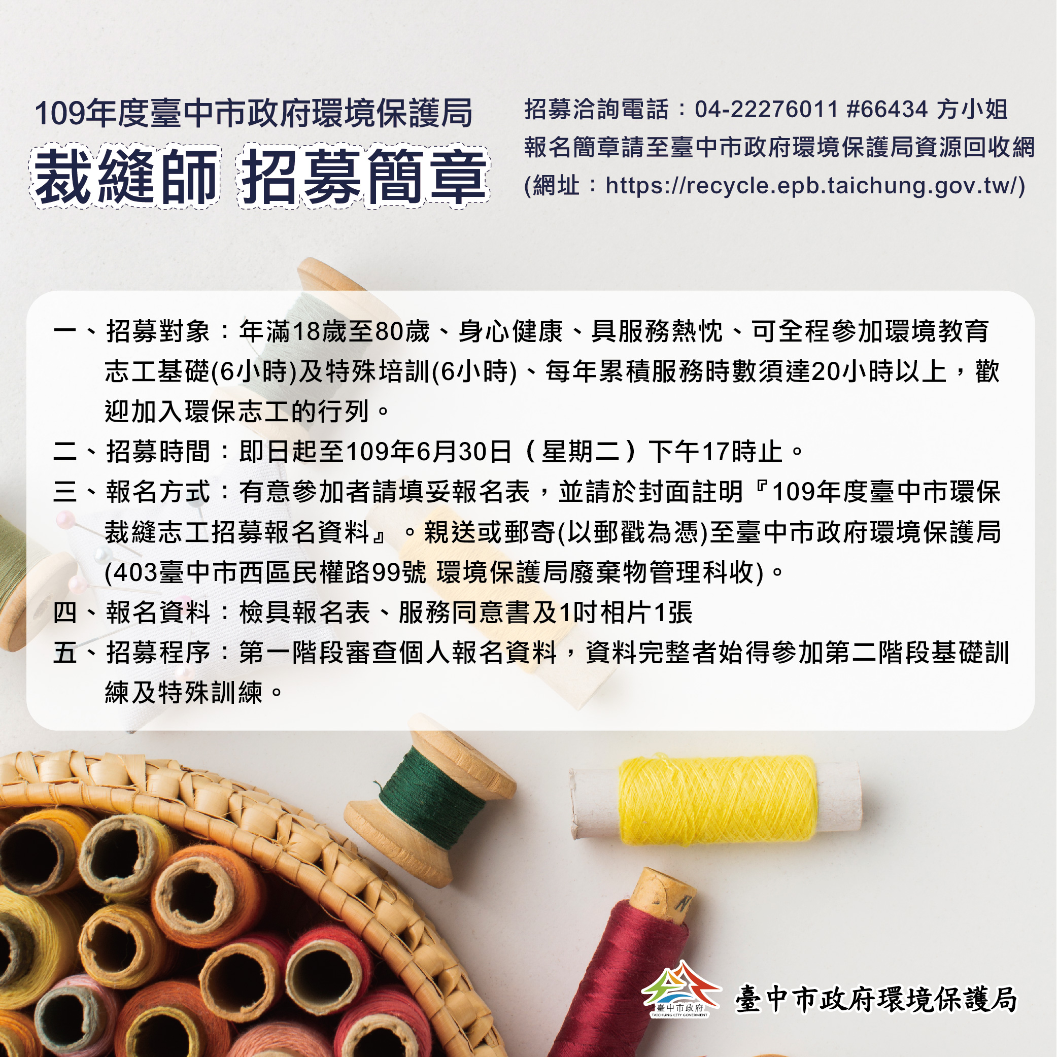 詳細招募辦法可至環保局資源回收網(http://recycle.epb.taichung.gov.tw/)查看下載,或洽詢資源回收志工招募聯繫窗口04-22276011分機66434,由方小姐提供諮詢服務。(6/19*11)*環保局
