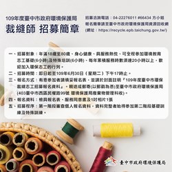 環保局進一步說明,「環保裁縫師」採書面報名,民眾可郵寄或親送向環保局報名,第一階段書審通過後,再依《志願服務法》規範,參加共12小時的基礎訓練及特殊訓練課程,凡參與資源回收環保志工者,另有保險及環境教育訓練活動等福利。
