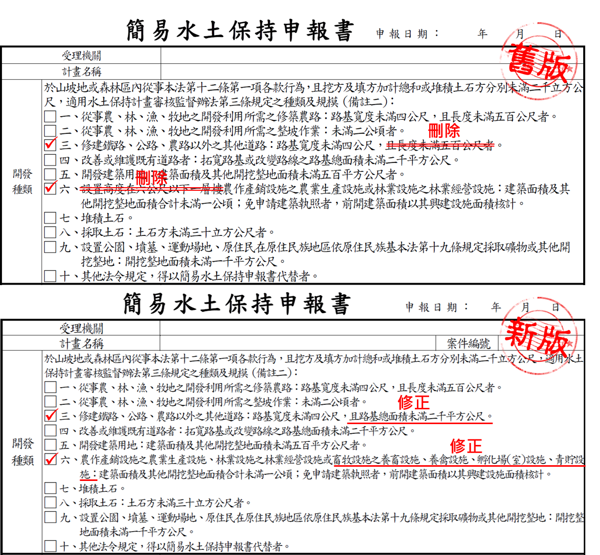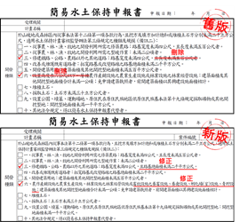 水利局補充,針對小面積且地勢平坦、聯外排水完善及無須設置擋土設施的建築類工程,簡易水保申報書採集中審查方式進行,透過一次審查、一次修正及一周核定為目標,加速簡易水保申報的核定作業。再次提醒,行政院農業委員會已於今年4月13日修正公告「簡易水土保持申報書」及「簡易水土保持處理完工申報書」等書面文件,市府水利局網站也同步更新完成,歡迎市民朋友可以連結至水利局官方網站 ( https://www.wrs.taichung.gov.tw/ ) 「人民申請下載專區」多加下載利用。(6/19*11)*水利局