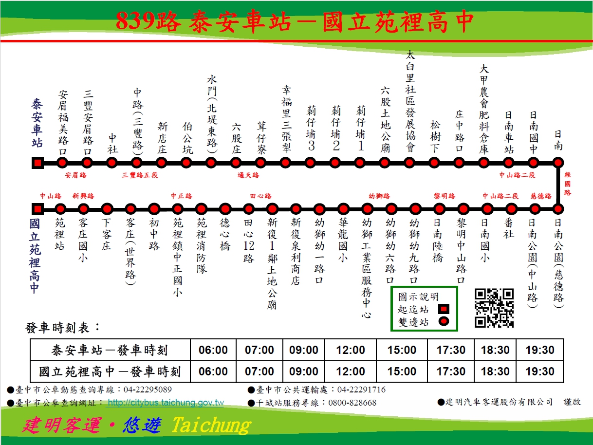 交通局提醒,839路「泰安車站-國立苑裡高中」將在7月1日起提供大眾運輸服務,每日營運時間從早上6時到晚間7時30分,每天共行駛16班次,可上交通局網站查詢(http://www.traffic.taichung.gov.tw),如有其他問題可撥免付費專線1999或使用台中公車APP,或上台中市即時公車動態資訊查詢(http://citybus.taichung.gov.tw/ebus),以免久候。(6/24*17)*交通局