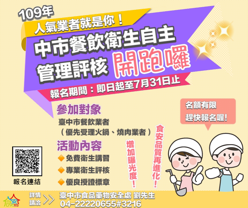 食安處指出,台中市火鍋及燒肉店新創林立,今年度開放100家名額,優先受理「火鍋」及「燒肉」業者報名評核,即日起,欲報名者可免費參加衛生講習,並獲衛生單位認可的教育時數,另因應「後疫情時代拚經濟!」除鼓勵優良餐飲業者踴躍報名參加自主評核外,也邀請業者共襄盛舉第2屆台中購物節,共同為食安及促進經濟發展盡心力,相關詳情請至( https://reurl.cc/V6ZXqb )報名。