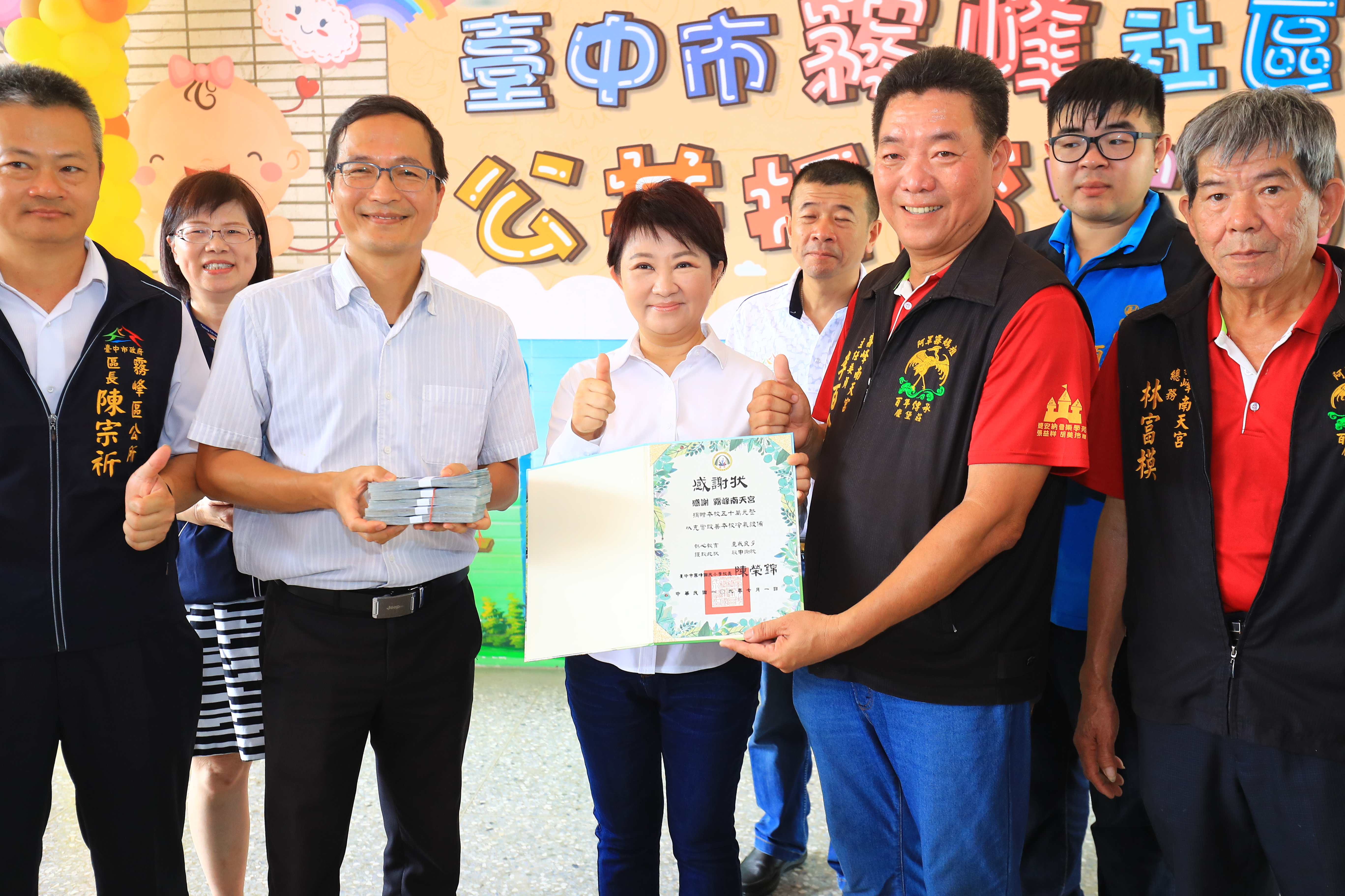今日開幕儀式由盧市長、彭局長、陳校長及立委陳柏惟、市議員林德宇、李天生共同為托育家園揭牌;當地信仰中心「南天宮」也於今日致贈霧峰國小50萬元經費購置冷氣,盧市長見證,感謝外界慷慨解囊,讓學生學習飲水思源。