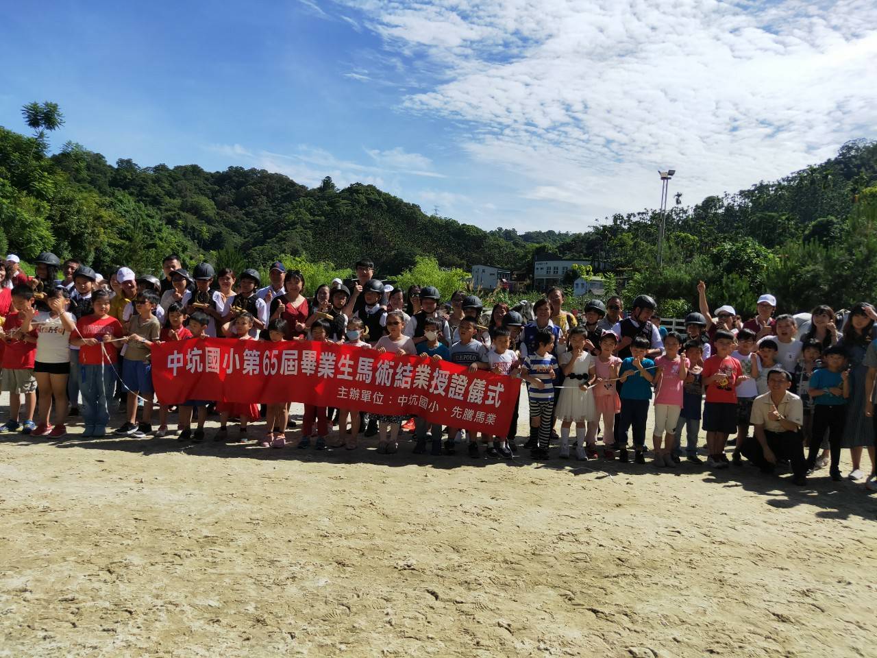 中坑國小今日畢業典禮,特別安排13位畢業生展現馬術教育的學習成果,由學弟妹擔任領馬者,讓學長姐騎馬登場,呈現團隊互助的「耶拿精神」,讓學生適性揚才、發展茁壯。活動精彩無比,來賓掌聲不斷。