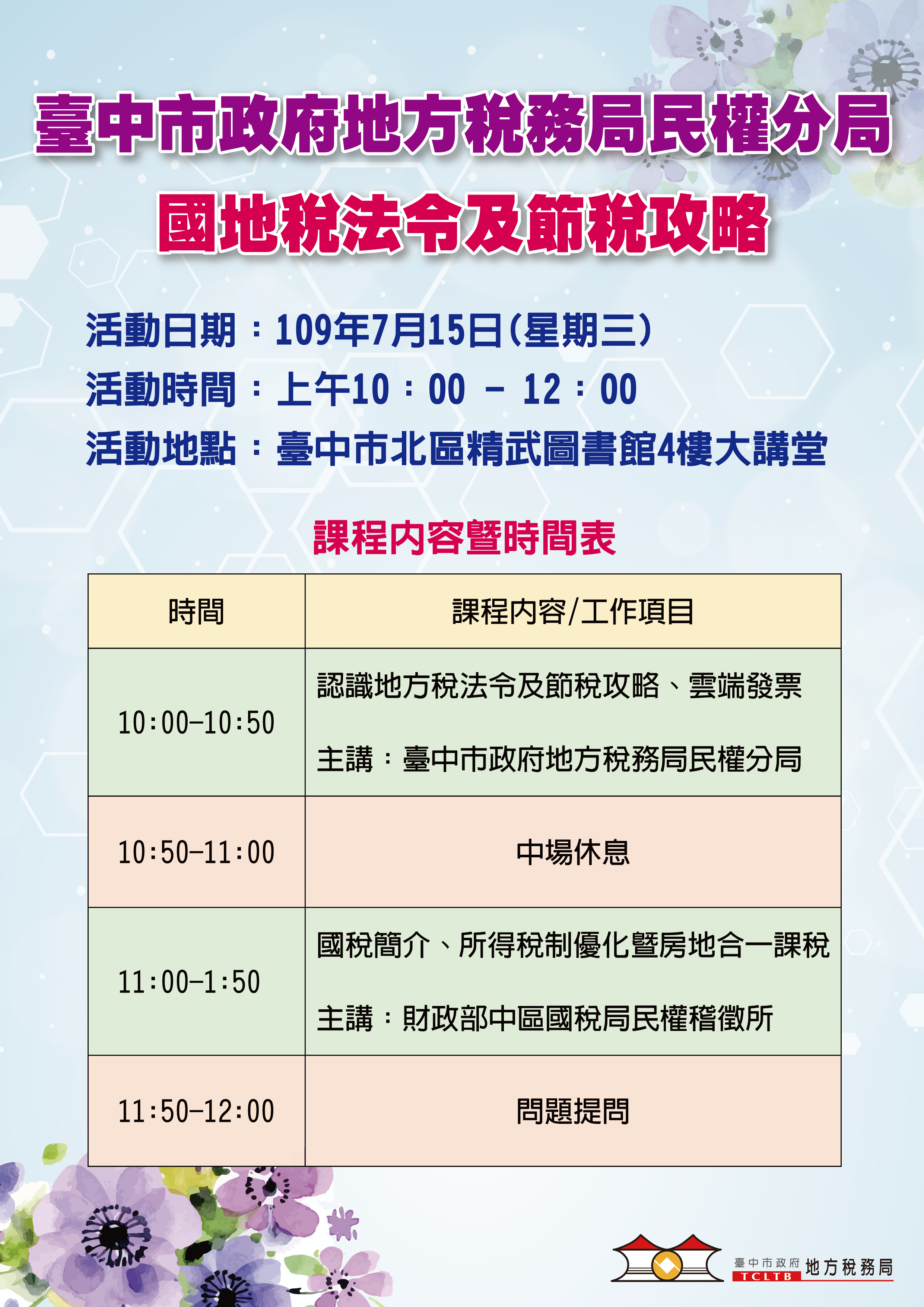 台中市政府地稅局為讓民眾認識最新稅務資訊,與中區國稅局預計7月15日在精武圖書館共同舉行「節稅攻略及國稅簡介」講座,內容包括所得稅制優化、房地合一課稅、雲端發票、如何使用手機條碼等,民眾攜帶未開獎發票可兌換多項宣導品,募集發票將全數捐贈社福團體,歡迎民眾踴躍參與。