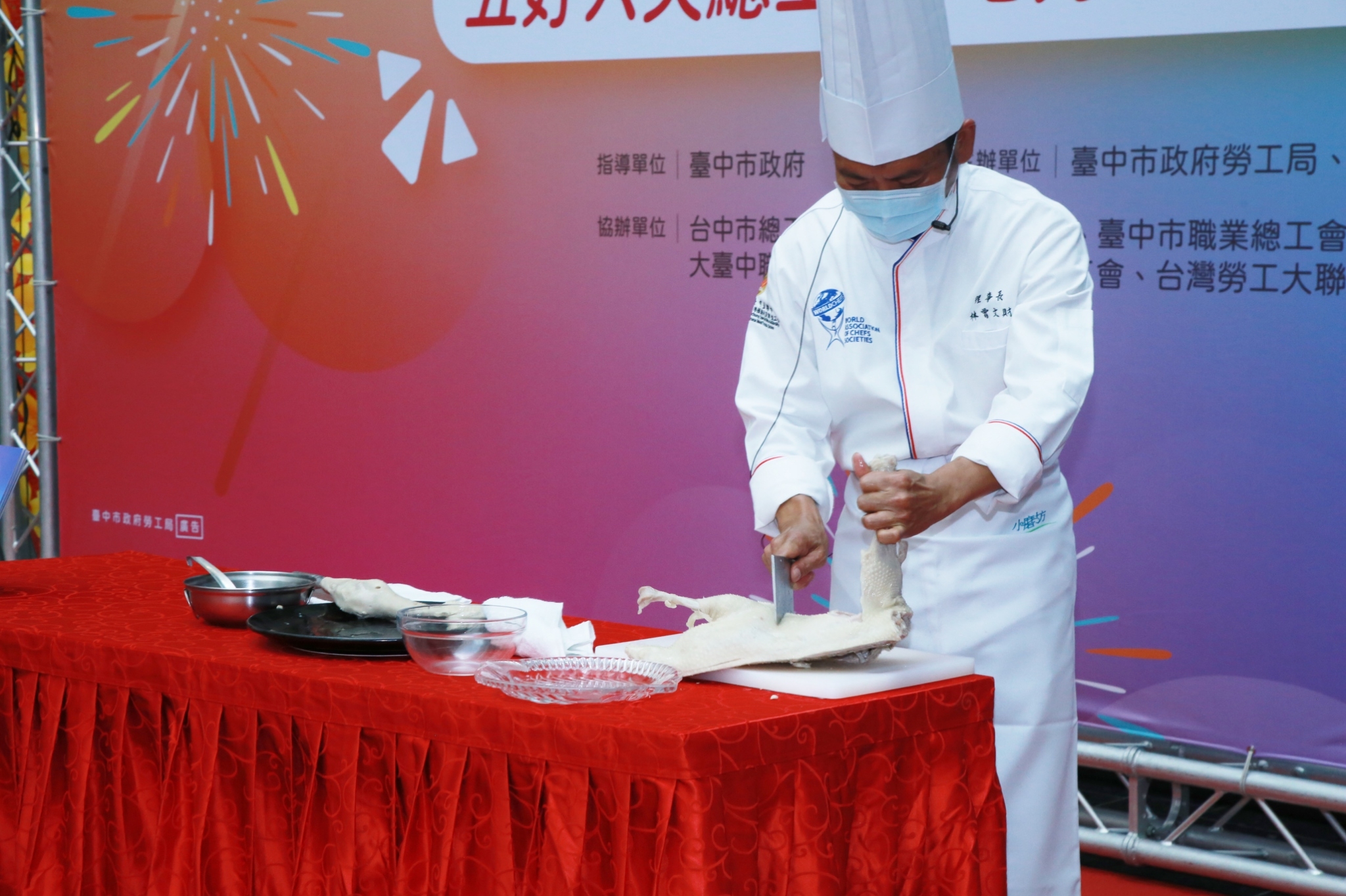 今日活動由中華民國外燴服務人員全國總工會理事長林曾文財展現精湛「鵝肉去骨功夫秀」拉開序幕,並由東達極品美饌提供海鮮生菜沙拉、新樂天飯店提供古早味米糕、小林無骨鵝肉海鮮提供鵝肉給民眾品嚐;以及Johnny Tsai男士理髮店設計師現場操刀理髮、台中市飾品加工職業工會展示各項手工皮件飾品、可艾通訊結合5G展示手機產品等。