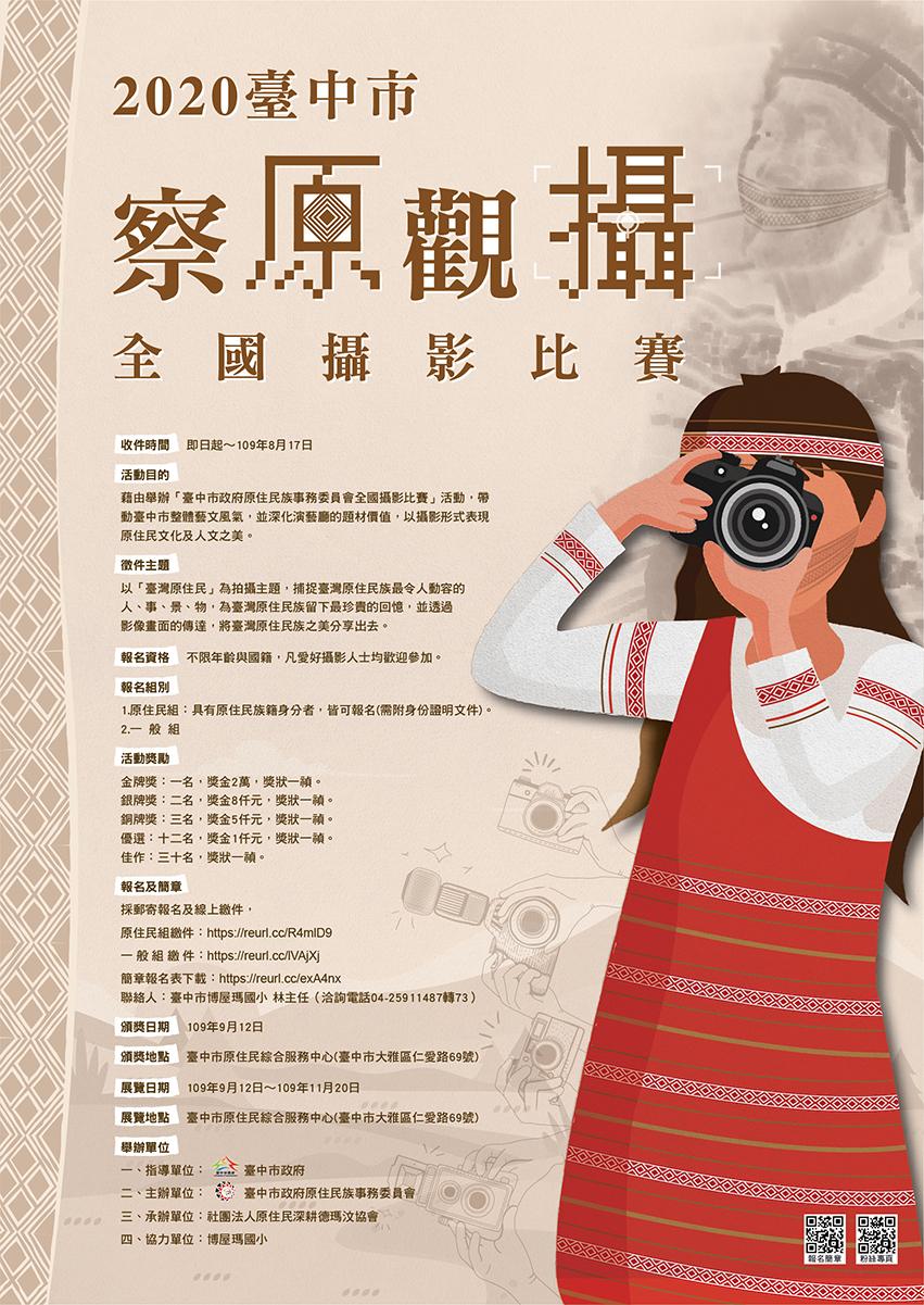 台中市政府原住民族事務委員會首次舉辦全國攝影比賽「察原觀攝」,以「臺灣原住民」為拍攝主題,捕捉原住民族最令人動容的人、事、景、物,為台灣原住民族留下最珍貴的回憶,透過影像畫面,傳達原住民族之美。