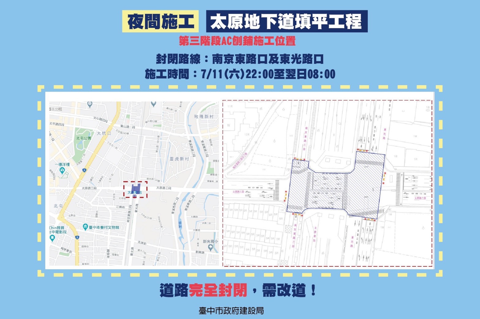 「距離完工又更近一步!」建設局陳大田局長表示,填平工程已進入最後施工階段,目前鐵路東側排水設施已完成,於7月11日及12日啟動夜間刨鋪作業,施作太原路近南京東路至旱溪西路段之路面,預計封閉南京東路與東光路路口,及太原路三段東行道路(東光路至旱溪西路),將採調撥車道方式維持東行車輛通行。