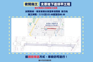 配合台中鐵路高架化,市府建設局辦理北屯區太原路地下道填平工程,已於6月10日全段主線開放通行,另為配合鐵路東側(東光路至旱溪西路)周邊排水設施完成,將進行鐵路橋下及東側路面刨鋪作業,於今(11)日與明日晚間22時至翌日上午8時進行夜間施工,將封閉太原與南京東路口及太原與東光路口,提醒用路人提前改道或聽從現場交通指揮人員指示行駛,確保行車安全。