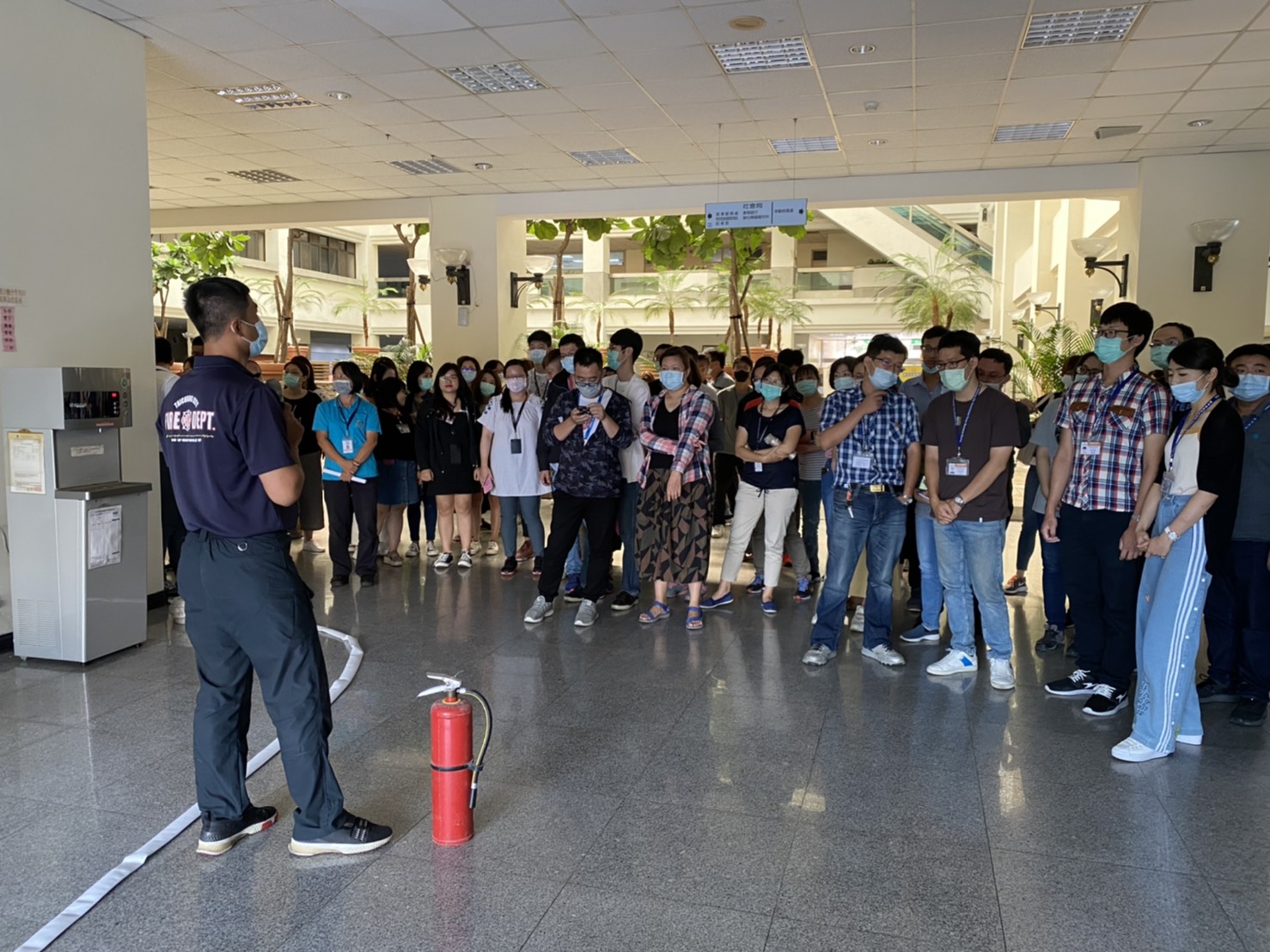秘書處長顏迺倫表示,自衛消防講習訓練為依據消防法規辦理,今年的演練邀請到消防局第六大隊黎明分隊小隊長李讚恭、第一大隊副大隊長楊世葆進行防火講習,內容包括火災預防知識、正確逃生觀念等;除室內課程,也進行自衛消防編組綜合演練,並實際操作滅火器材。