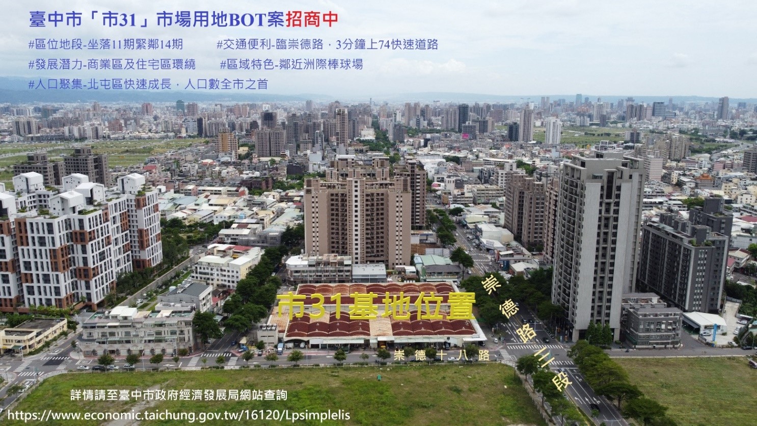 「市31」BOT案今起公告70天,申請至109年9月22日止,投資人可至經發局租賃、出售、促參案等招標公告專區( https://www.economic.taichung.gov.tw/16120/Lpsimplelist )或「財政部推動促參司民間參與公共建設網際網路首頁投資資訊專區」下載招商文件。