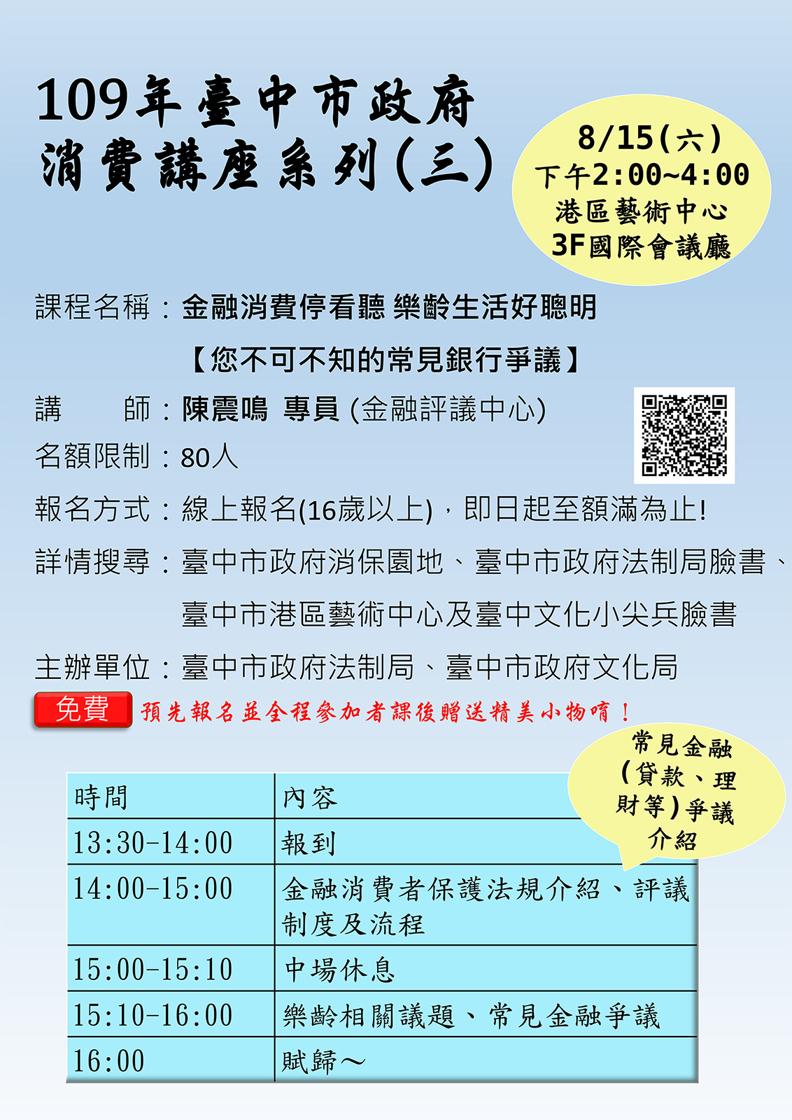 台中市政府法制局攜手文化局及財團法人金融評議中心,在暑假期間開辦「109年台中市政府消費講座」系列課程,第三場次「金融消費停看聽 樂齡生活好聰明-您不可不知的常見銀行爭議」將於8月15日下午2至4時在台中市港區藝術中心3樓國際會議廳舉行,即日起開放報名,歡迎16歲以上民眾踴躍參與,充實理財知識也協助家中長輩保住老本!