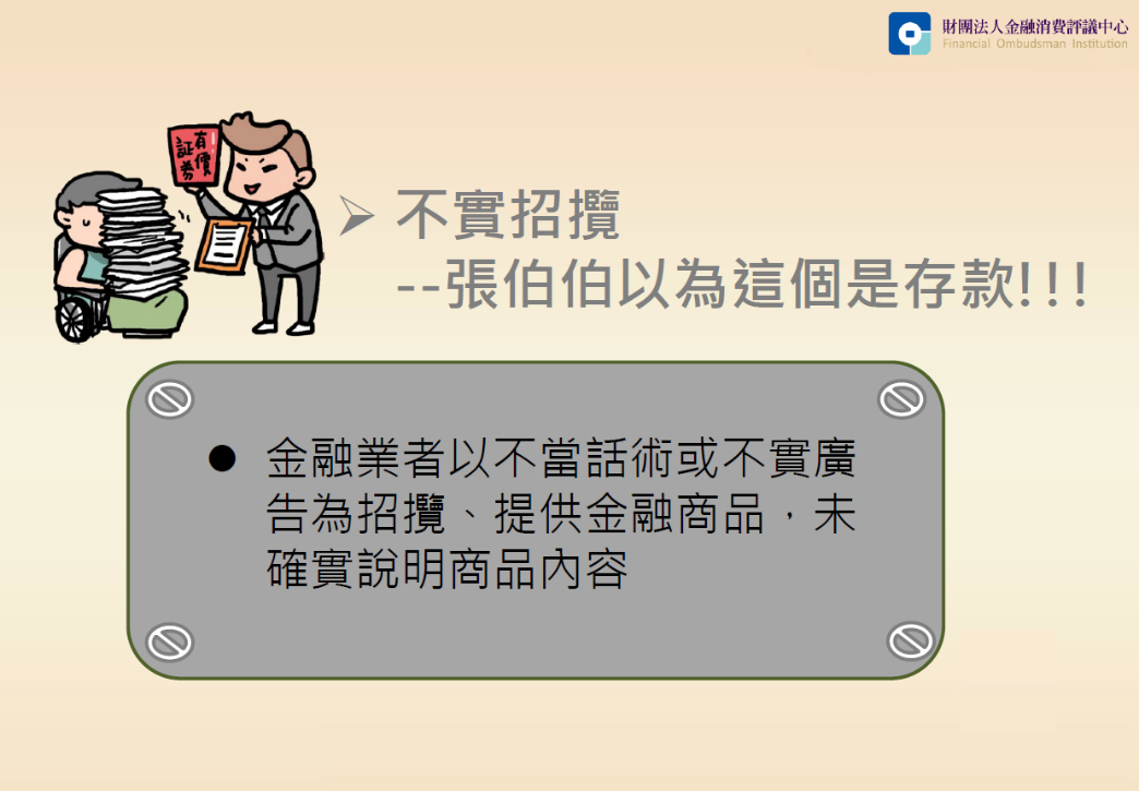 舉例來說,業者以優惠存款專案名義招攬長者,卻未詳實說明實際專案的商品,其實是「保險」,也沒有具體告知繳費期間;等民眾第2年收到繳費通知,或不想繼續繳納時,才發現所謂的「優惠存款」根本不是「定存」。也有業者不當勸誘沒有工作收入的高齡者,投資風險高的金融商品,卻未加以說明,等這群高齡者中途想要終止契約或期滿領回時,才發現投資與預期相差頗多,甚至呈現虧損狀態。
