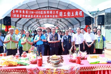 建設局今日舉行「東區10M-400道路開闢工程(銜接台中糖廠區段徵收工程聯外道路)」開工典禮,包括黃副市長、建設局長陳大田、勞工局副局長羅群穆、市議員李中、台灣糖業股份有限公司中彰區處經理曾吉松、東區區長陳佩玉、泉源里長羅文甫等人皆到場共襄盛舉;立委黃國書、市議員何敏誠、鄭功進、羅廷瑋、邱素貞服務處代表也到場致意。(7/20*7)*建設局