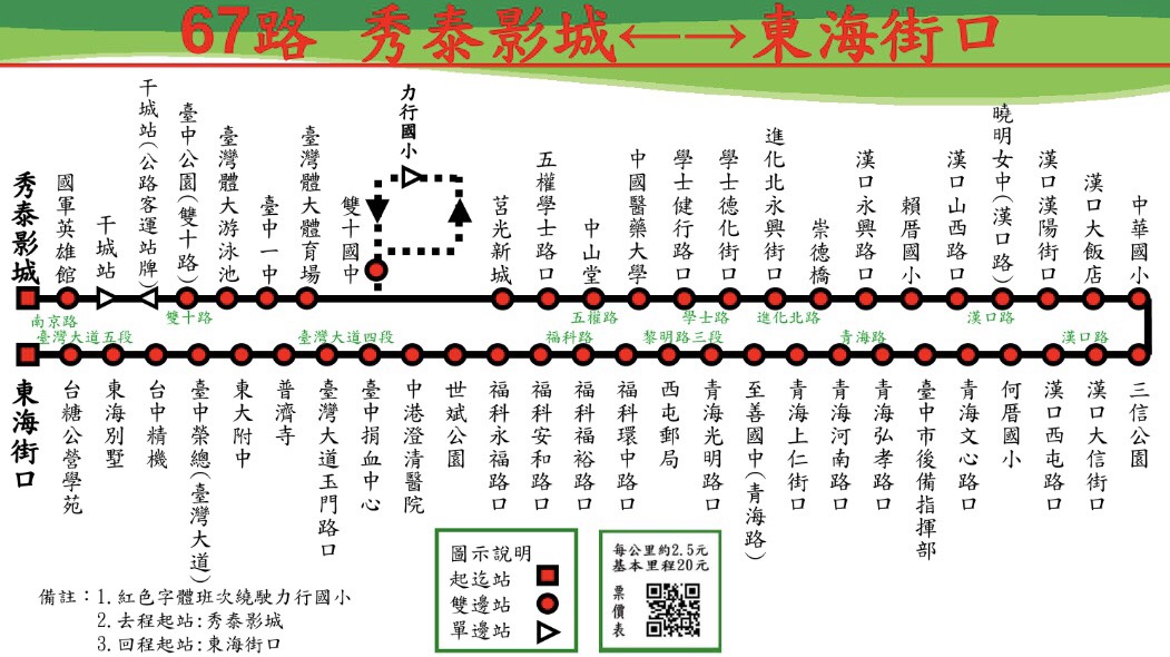 交通局長葉昭甫表示,67路公車在代駛期間從原路線每天共28班次(其中7班次繞駛力行國小)調整為24班次(其中4班次繞駛力行國小),更新時刻表可至「台中市即時公車動態資訊」網站查詢(http://citybus.taichung.gov.tw/ebus)、或到「台中市政府交通局」官網(https://is.gd/MTPvdg)下載台中公車APP。交通局也將提醒代駛業者在公車沿線各站牌張貼公告,避免民眾久候。
