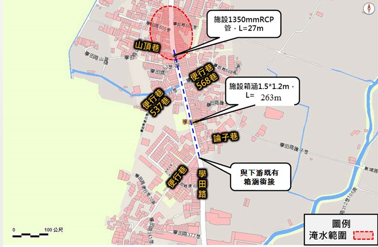 水利局表示,烏日區學田路近年居住人口增加,惟排水系統未臻完善,每逢颱風豪雨,即造成該區學田路便行巷至722巷一帶,側溝排水系統無法負荷發生積淹水情事,水利局已完成第一期(學田路三號橋至學田路便行巷口)工程,總長度370公尺,目前第二期工程新建雨水下水道總長度約290公尺,總經費約1,667萬元,預計明年10月底完工,完工後,將可望改善該區積淹水困擾,改善面積約10公頃。