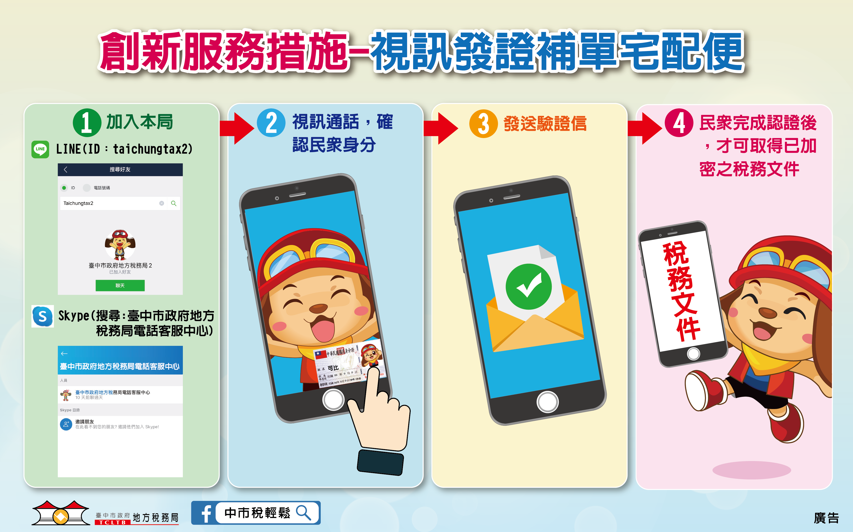 數位時代,行動裝置普及,台中市政府地方稅務局推出創新便民措施「視訊發證補單宅配便」,市民不需出門、不用憑證,LINE搜尋ID「taichungtax2」加入「臺中市政府地方稅務局2」LINE帳號,或Skype搜尋「臺中市政府地方稅務局電話客服中心」,就可輕鬆藉由視訊通話確認身分,全程僅需10分鐘,就可收到稅單或繳納證明。