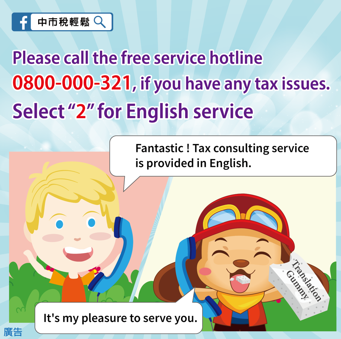 國稅、地方稅免付費專線0800-000-321即日起提供雙語服務