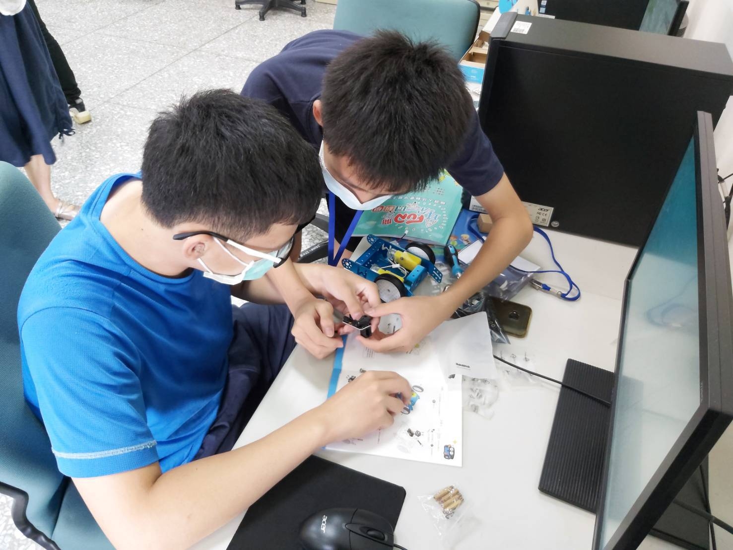 這次夏令營第一、二天邀請科技創意發明教育學會老師劉俊佑,指導聽障生學習程式設計基本概念、設計機器人行走動作,並透過程式碼的編組與運用驅動機器人走迷宮,讓學生們嘖嘖稱奇;第三天則邀請台灣三軸科技工程師引導學生設計圖案,再運用雷射打標機呈現在鑰匙圈、金屬筆與隨身鏡上。