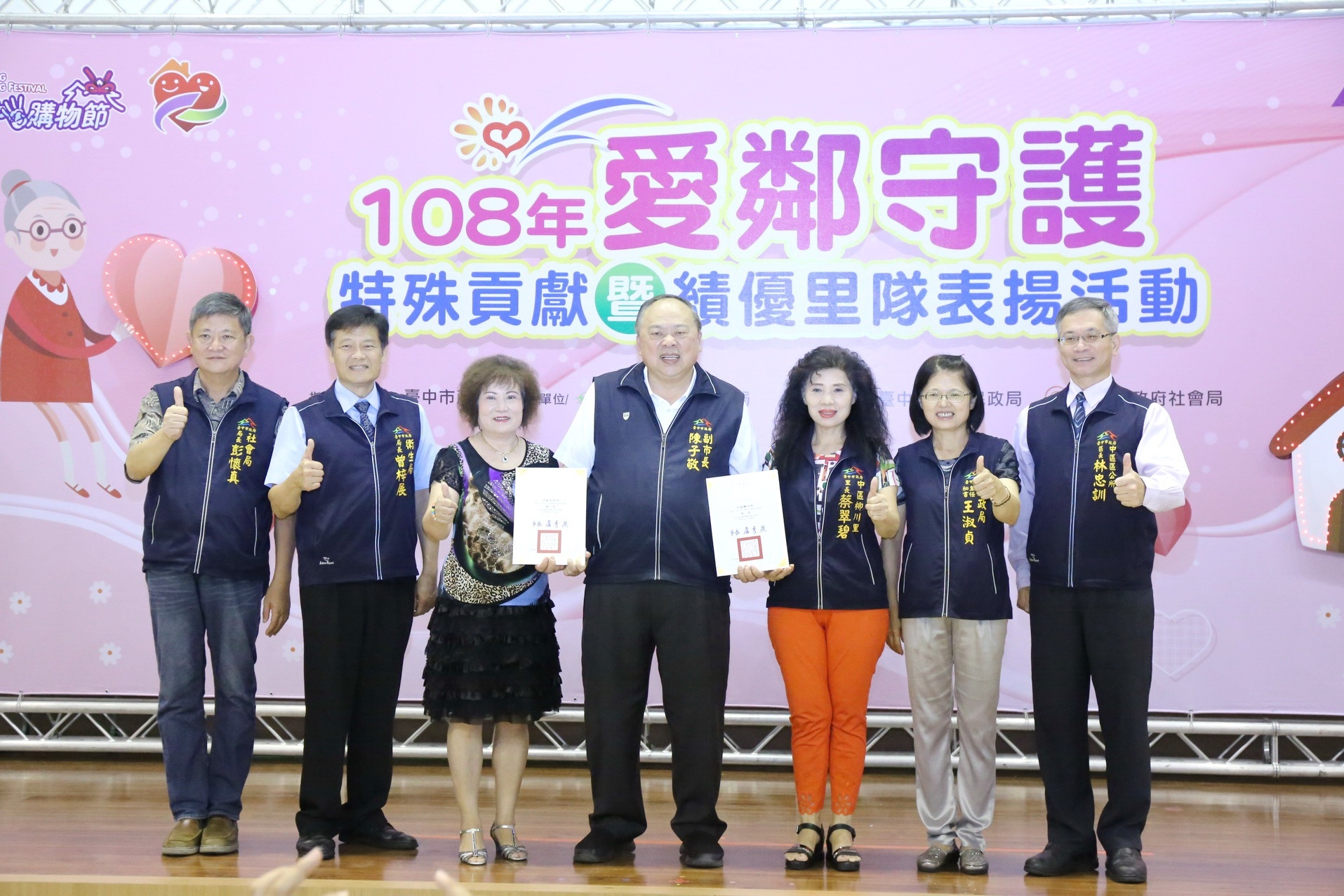 今日頒獎典禮包括陳副市長、衛生局長曾梓展、社會局長彭懷真、民政局主任秘書王淑貞、市議員陳本添等人都到場向受表揚的愛鄰守護隊志工致謝,立法委員張廖萬堅、市議員陳文政、黃健豪、沈佑蓮、劉士州、陳淑華、黃馨慧、陳政顯、林祈烽、鄭功進服務處代表也到場致意,場面熱鬧。(7/31*7)*衛生局