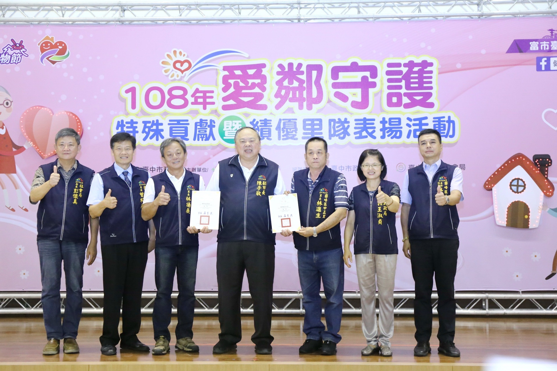 陳副市長表示,台中市是全國第二大城,也是宜居城市,成就這個幸福城市,就是因為大家的付出,讓各縣市民眾想移居到台中來;而全市目前有36萬多名長輩,占總人口數近13%,面對少子化、高齡化趨勢,台中以社區為基礎,結合民政局、社會局及衛生局組成「愛鄰守護隊」,以鄰近關懷、在地守護精神,運用市府與民間鄰里資源,照顧社區長者及弱勢族群,提供及時關懷服務,讓需要幫助的市民多一份支持及安定。