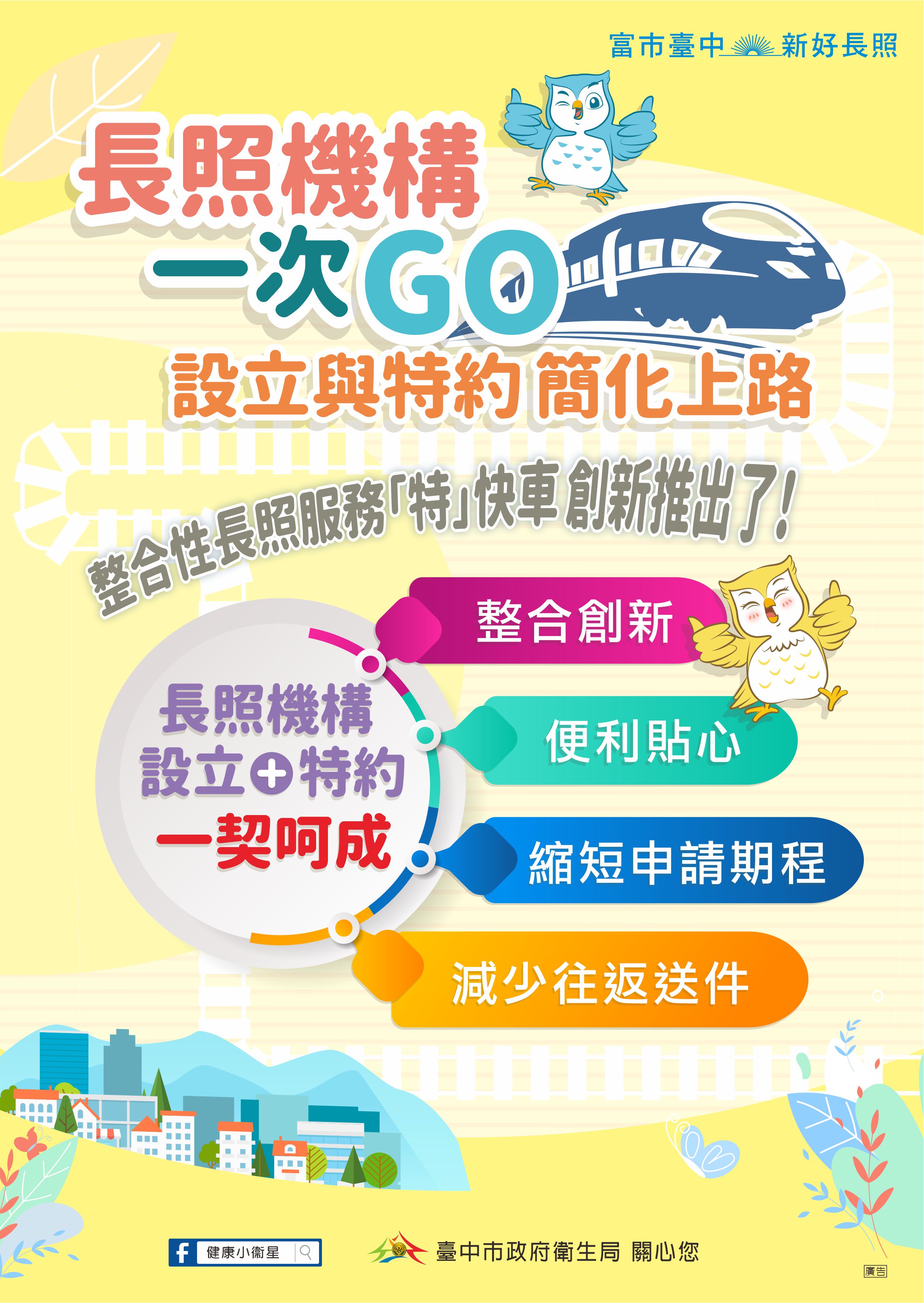 為使長照服務能更快輸送至各社區中,台中市政府衛生局創新推出整合性「長照服務特快車-長照機構設立與特約一契呵成」專案,有意願投入長照服務領域者,備齊相關文件後,可一次性送件,同時申請機構設立與特約2項業務,專案自8月1日起開放申請,除加速提供長照服務,更達到簡政便民的效能。