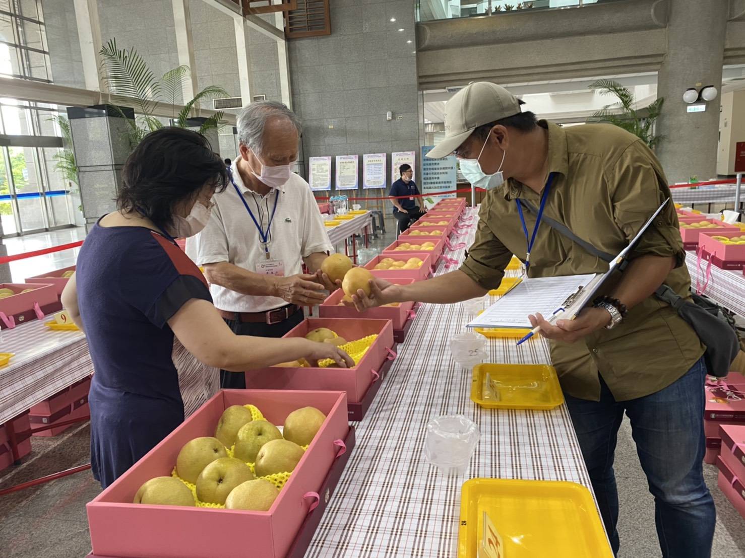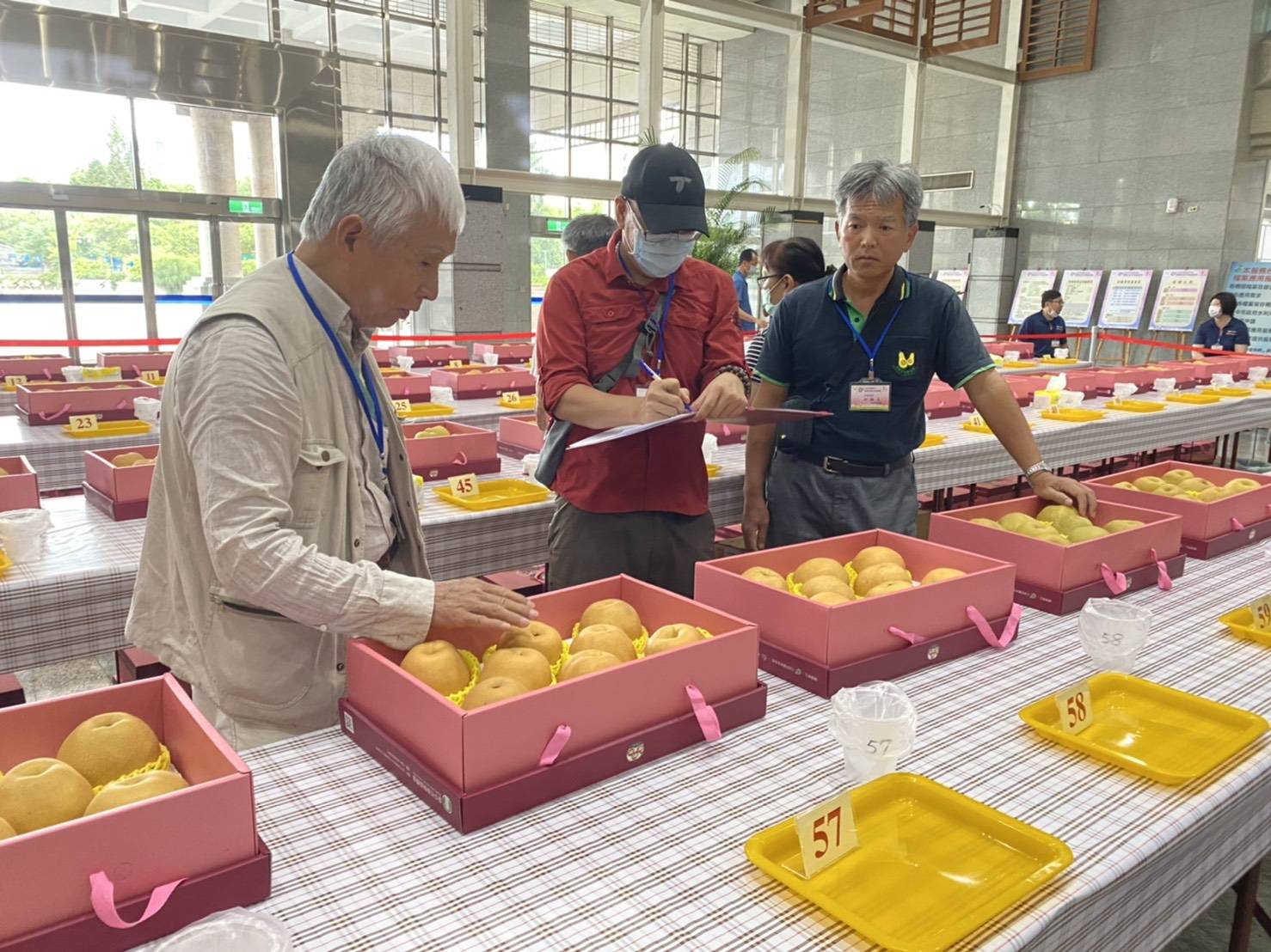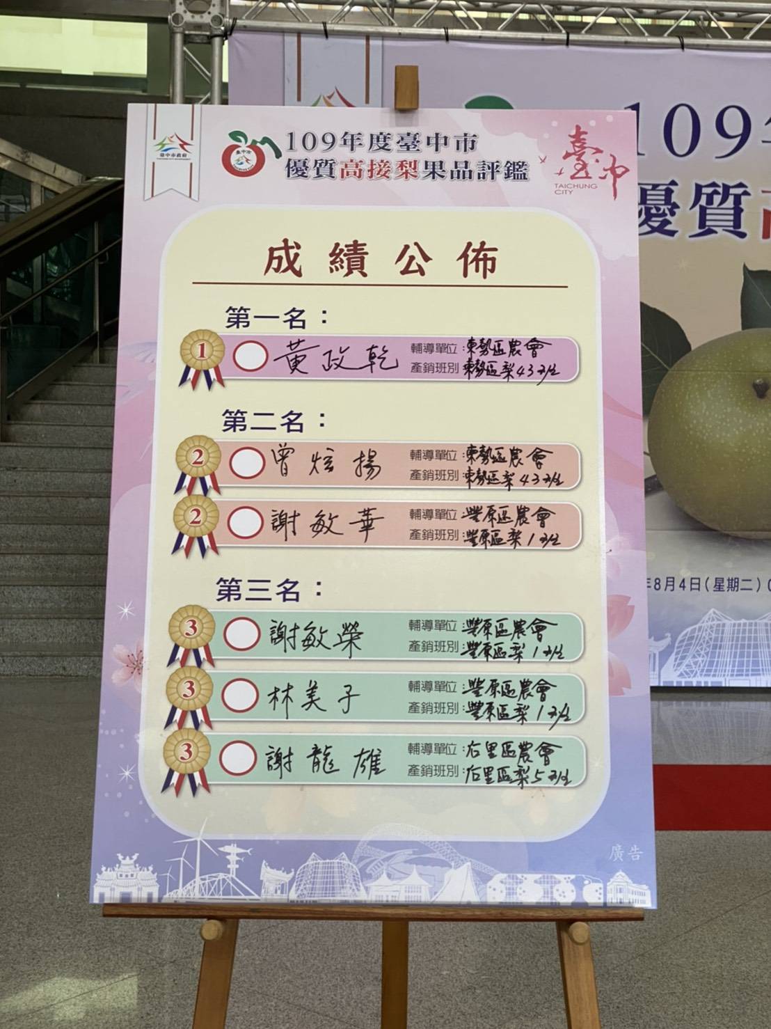 台中市政府農業局持續推廣在地優質農特產品,提升高接梨栽培技術及果品品質,輔導東勢區農會今(4)日在陽明市政大樓舉辦「109年台中市優質高接梨果品評鑑活動」,共60組產銷班農民報名參加,經專家評選,東勢區黃政乾脫穎而出拿到第1名,成為今年度的高接梨王;第2名為東勢區曾炫揚及豐原區謝敏華,第3名由豐原區謝敏榮、林美子及后里區謝龍雄獲得。