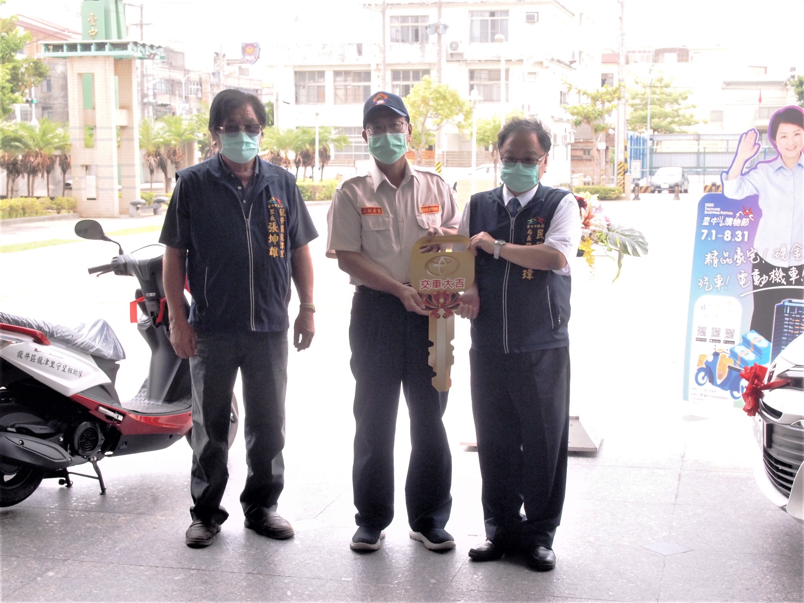 為加強守望相助巡護機動性及安全性,台中市政府補助龍井區龍東里及龍津里守望相助隊購置新巡邏汽、機車,今(10)日在龍井區公所舉行交車典禮,民政局長吳世瑋主持交車儀式,將汽車及機車鑰匙分別交給龍東里及龍津里守望相助隊,盼提高巡守安全性及效能。
