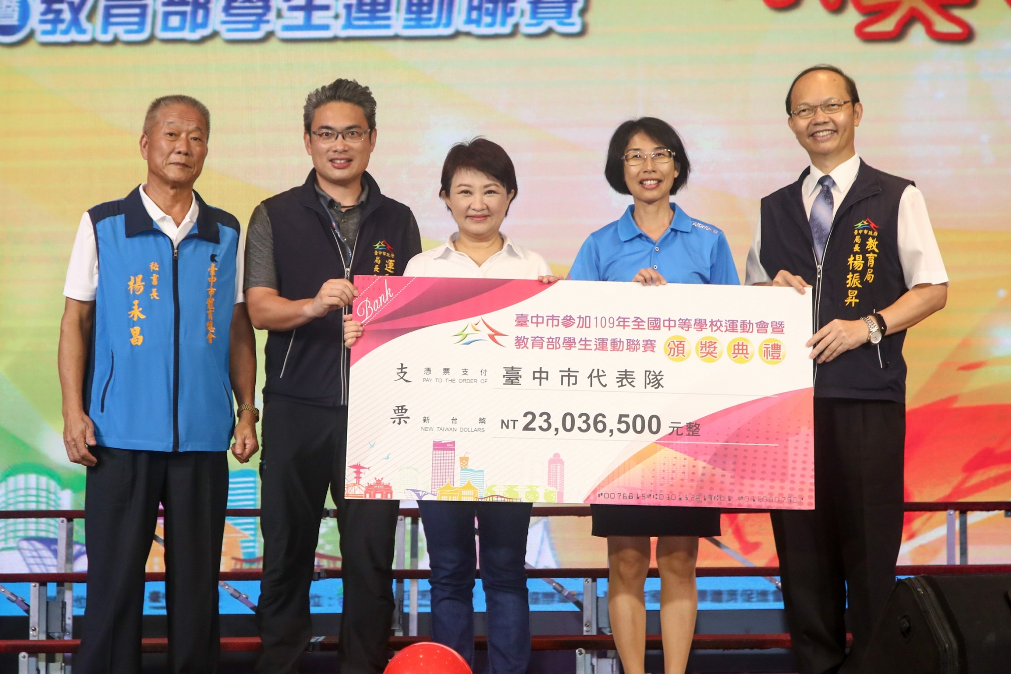 今日活動,市長盧秀燕、教育局長楊振昇、運動局長李昱叡出席,市議員劉士州到場,立委莊競程、前立委顏寬恒、台中市議會副議長顏莉敏、市議員朱暖英、何文海也派代表,與台中市體育總會秘書長楊永昌一同恭賀獲獎者。(8/10*10)*教育局