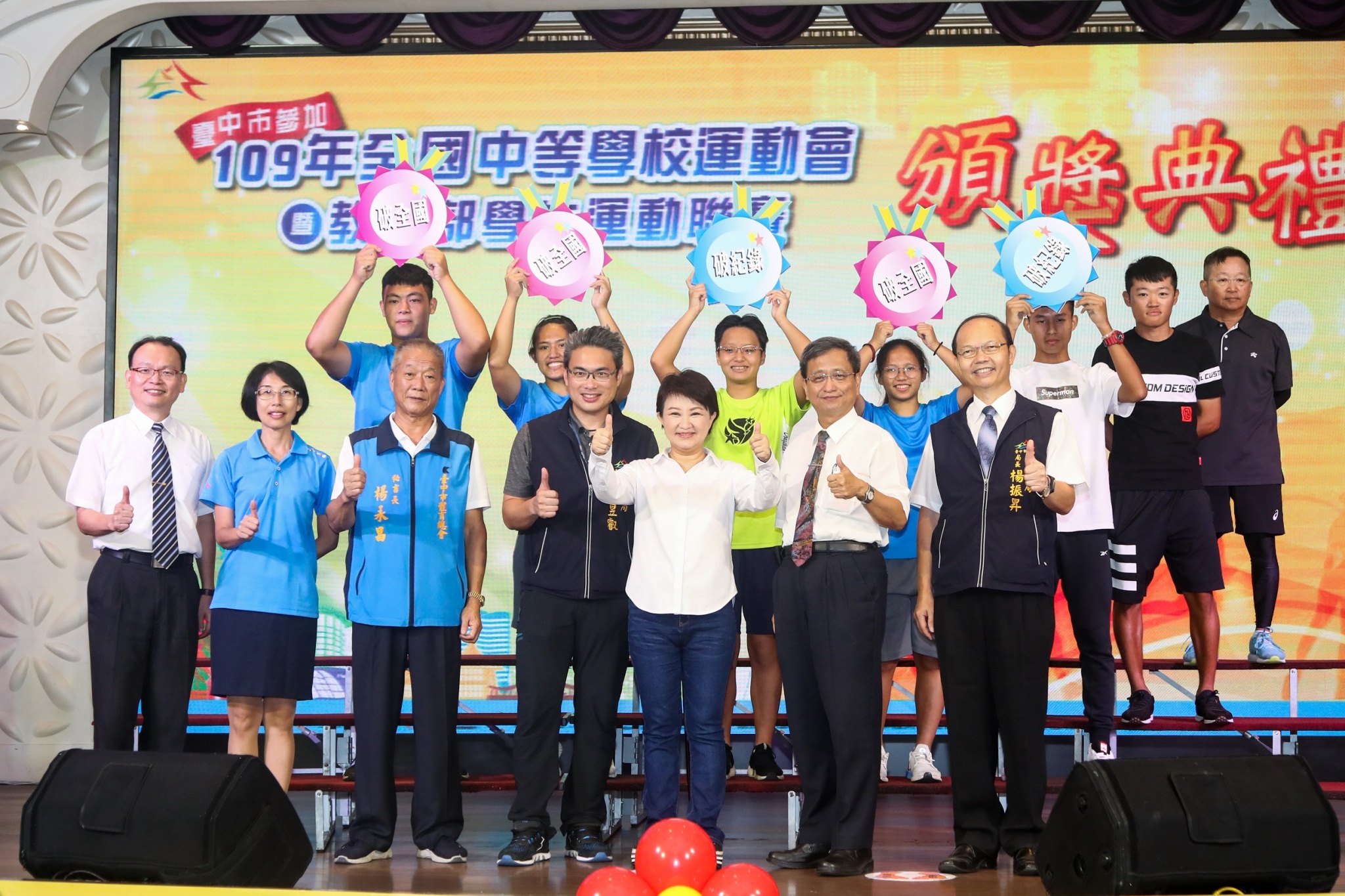 (10)日市府設宴表揚傑出學校、教練及選手,市長盧秀燕出席開心與學生合照、為績優教練及選手頒獎,現場溫馨熱鬧。盧市長代表市民感謝選手的努力,她表示,各位選手是台中的英雄、為台中爭光,希望未來繼續加油。