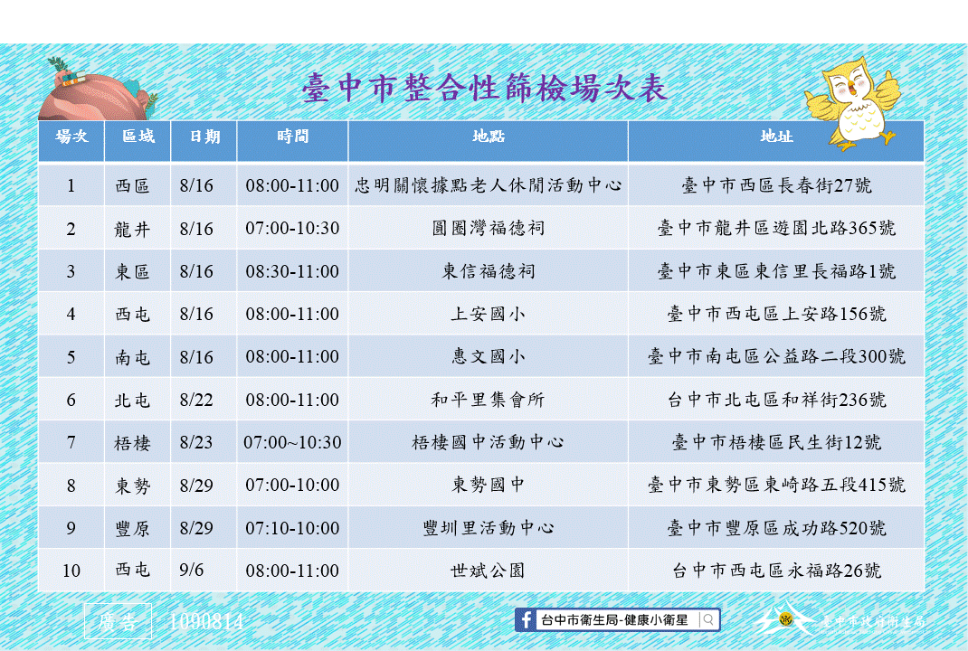 衛生局提醒,民眾若符合篩檢資格者,只要攜帶健保卡至健保特約醫療院所接受篩檢,或就近至轄區衛生所洽詢,即可獲得成人預防保健服務的資訊;也可利用假日參加社區的整合性篩檢健檢。更多訊息請至台中市衛生局《健康小衛星臉書粉絲團》(https://www.facebook.com/HealthTaichung/)追蹤查詢。(8/16*6)*衛生局