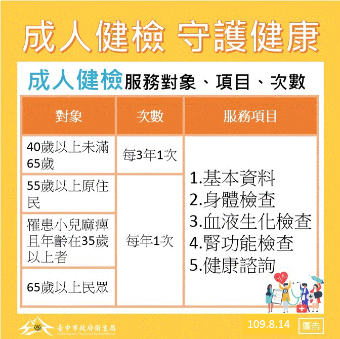 衛生局說明,成人預防保健服務篩檢對象為40歲至64歲民眾,政府提供每3年1次補助;另65歲以上民眾、55歲以上原住民、罹患小兒麻痺且年齡在35歲以上者,可每年做1次;45歲至53歲民眾、40歲至60歲原住民,也可接受終身1次的B、C肝炎檢查。