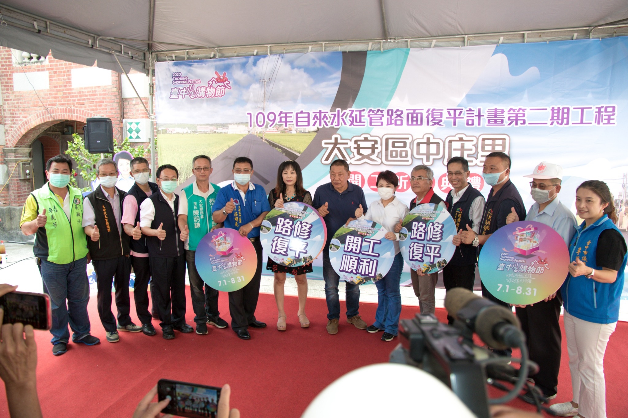 台中市政府近積極推動自來水延管計畫,其中大安區已陸續完成中庄里、龜殼里及福興里等大區域延管工程,區內自來水普及率由105年的62.9%提升至今年74.6%,大幅提升11.7%;市府今(17)日於大安區政天宮舉行延管後路面復平開工典禮,預計整修中庄里約13,160公尺路面,11月底完工,將有效改善道路品質,提升用路環境。