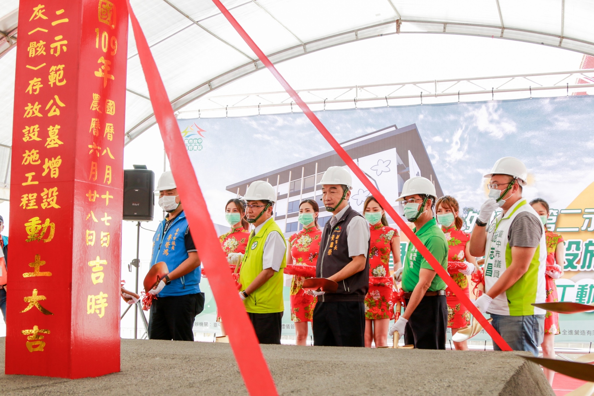 台中市政府為滿足民眾治喪設施需求,解決納骨塔櫃位不足問題,今(17)日於外埔區第二示範公墓舉辦納骨塔增設工程開工破土典禮,規劃興建地上五層建物,外觀創新以油桐花造型結合牆體,呼應外埔客家精神,完工後將可提供超過2萬個骨灰(骸)櫃位,預計111年完工、112年啟用。