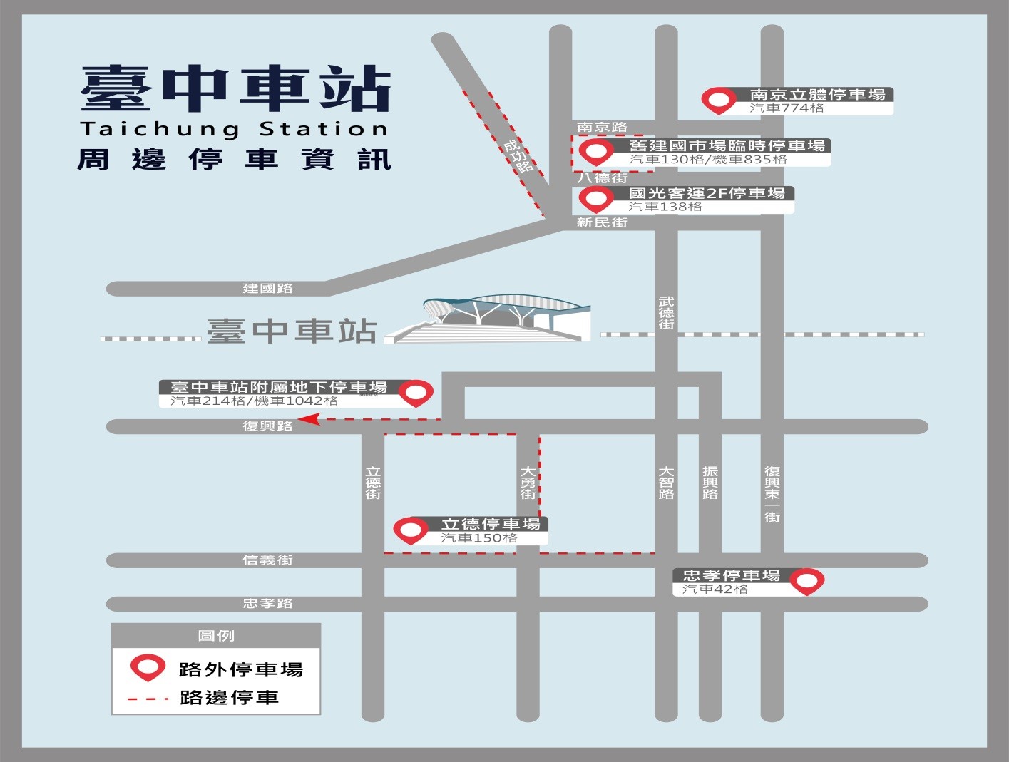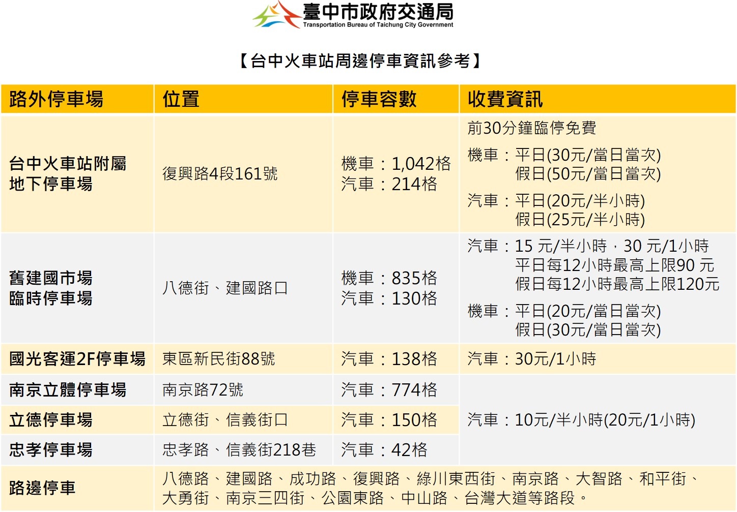 交通局長葉昭甫表示,台中車站周邊既有多處路邊及路外規劃汽、機車停車空間,包括路外停車場「舊建國市場臨時停車場」提供機車835格、汽車130格;東區「國光客運2F停車場」設置汽車138格;「南京立體停車場」汽車774格;「立德停車場」汽車150格;「忠孝停車場」汽車42格。