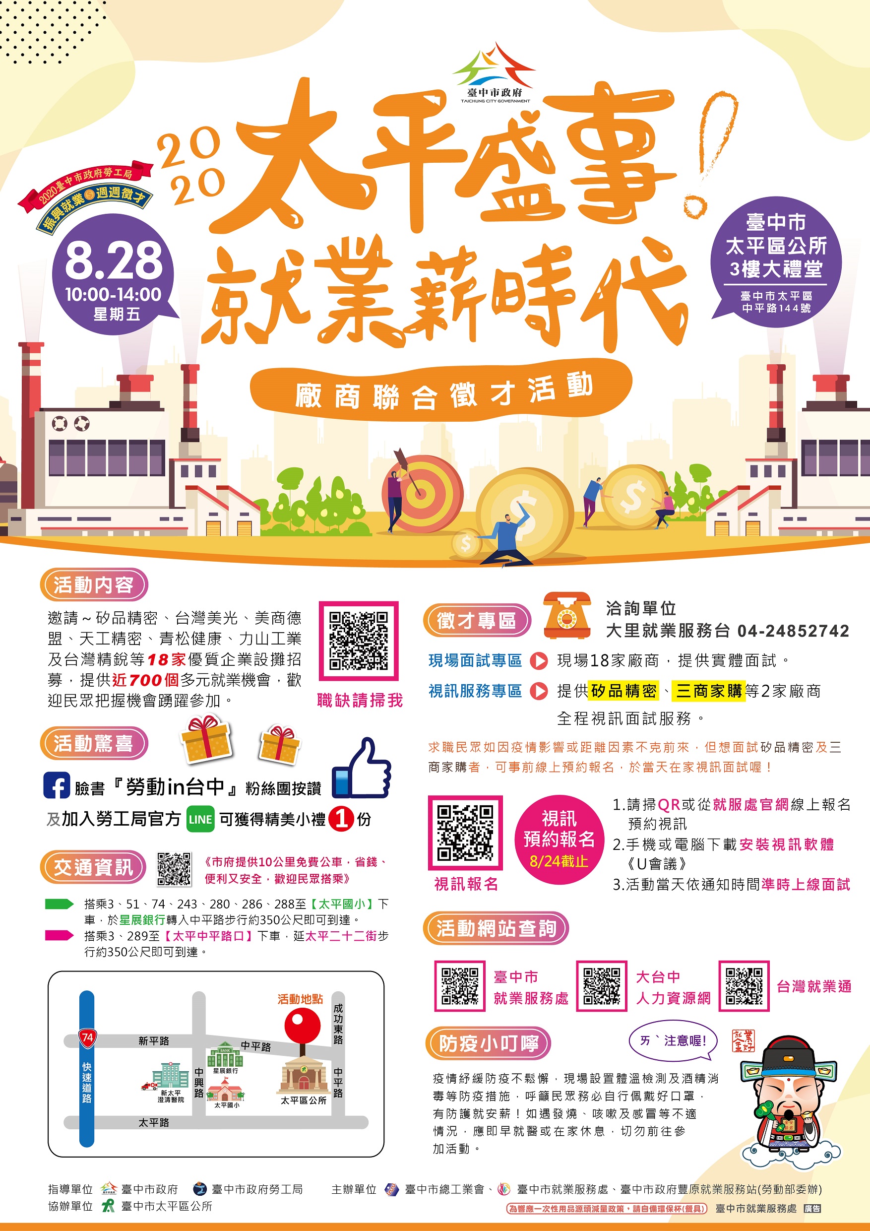 詳細活動資訊,可至台中市就業服務處網站( https://www.eso.taichung.gov.tw/2273594/post )或大台中人力資源網( https://takenjob.taichung.gov.tw/WebPages/Event_manage.aspx?event_id=10731 )查詢,或電洽台中市就業服務處各就業服務站/台,提供免費求職求才服務。(8/24*7)*勞工局